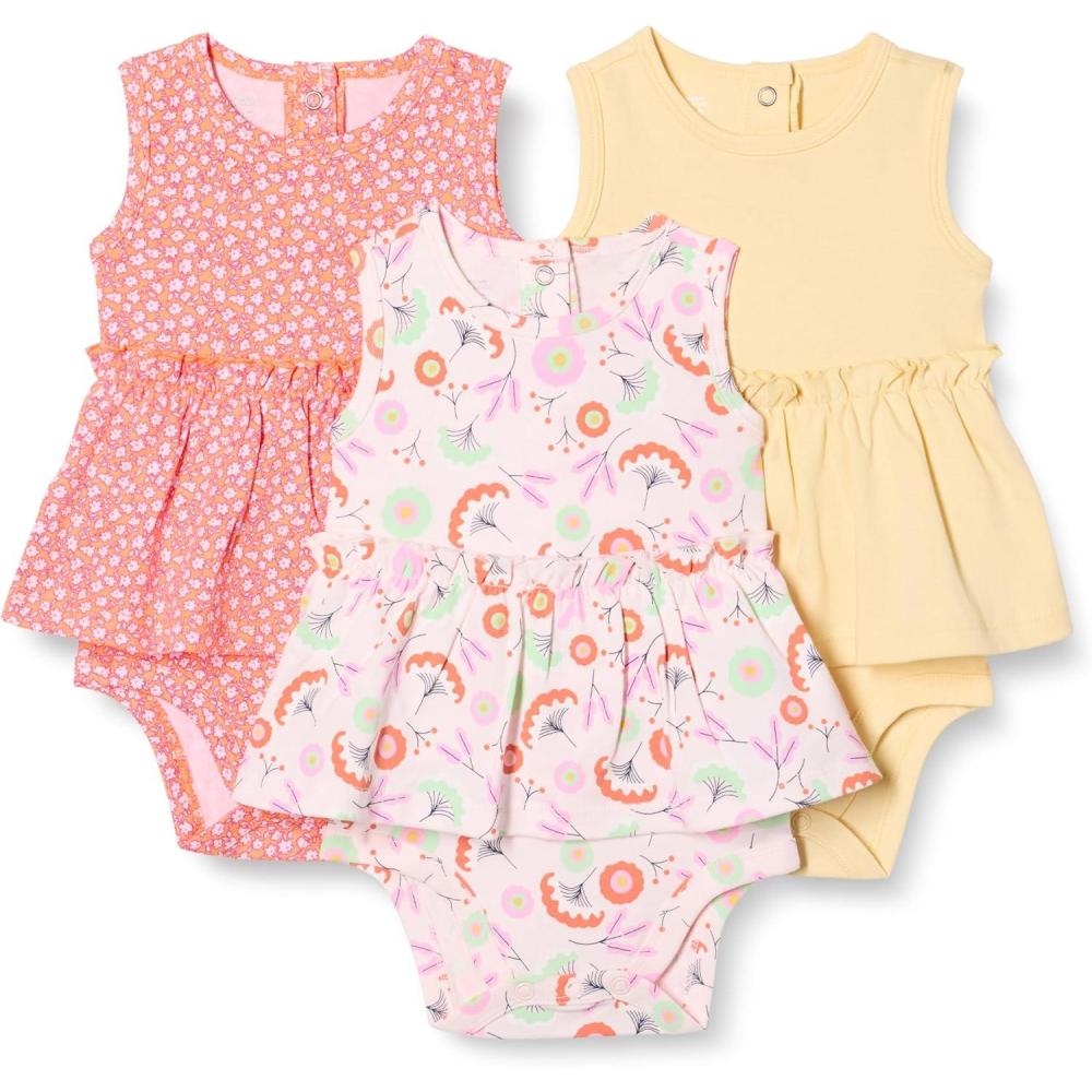 Amazon Essentials Baby Girls’ Sleeveless Bodysuit Dress, Pack of 3(Pale Yellow/Floral)