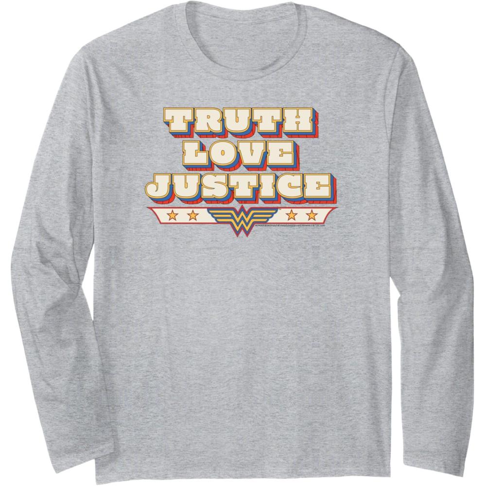 imageAmazon Essentials DC Comics Wonder Woman Truth Love Justice Long Sleeve TShirtHeather Grey