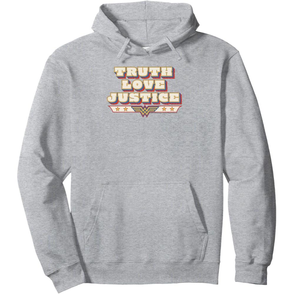 imageAmazon Essentials DC Comics Wonder Woman Truth Love Justice Pullover HoodieHeather Grey