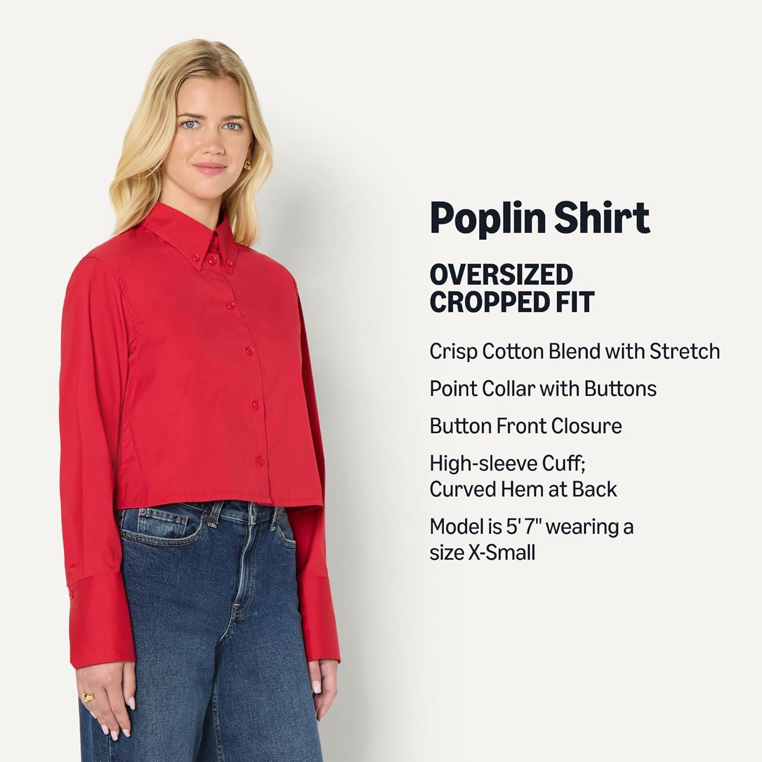 Amazon Essentials (Demi’s Pick) Women’s Modern Oversized-Fit Cropped Cotton Stretch Poplin Button-Down Shirt(Red)