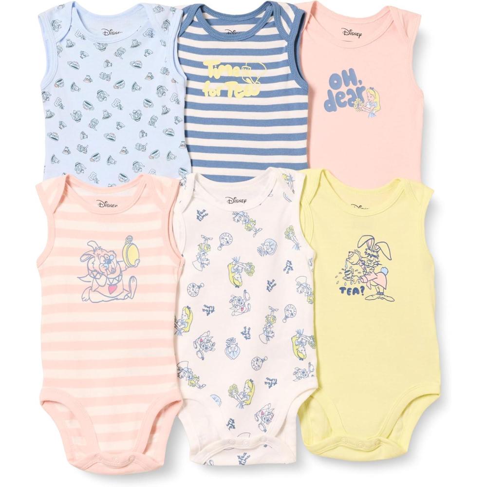 Amazon Essentials Disney | Star Wars | Princess Baby Girls’ Sleeveless Bodysuits, Pack of 6(Alice Tea Party)