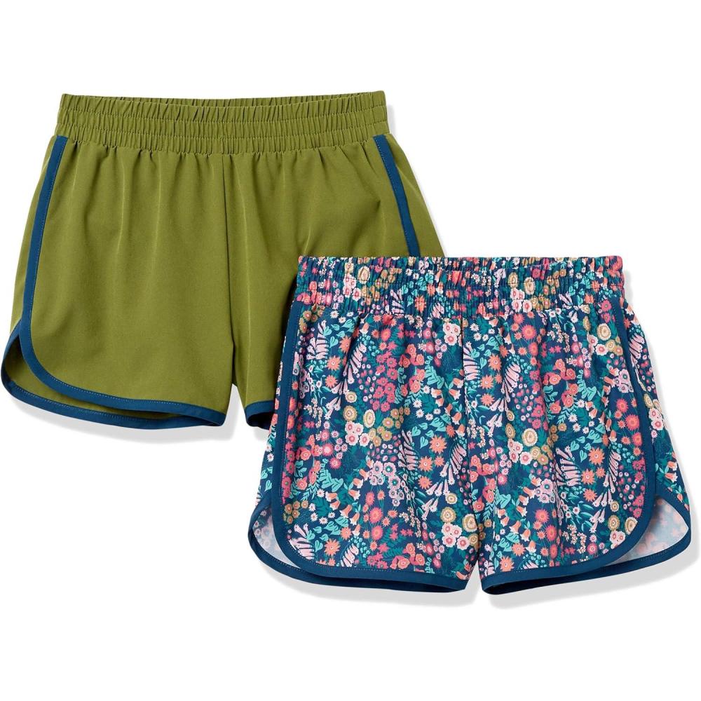 Amazon Essentials Girls and Toddlers’ Active Running Shorts, Pack of 2(Olive Floral)