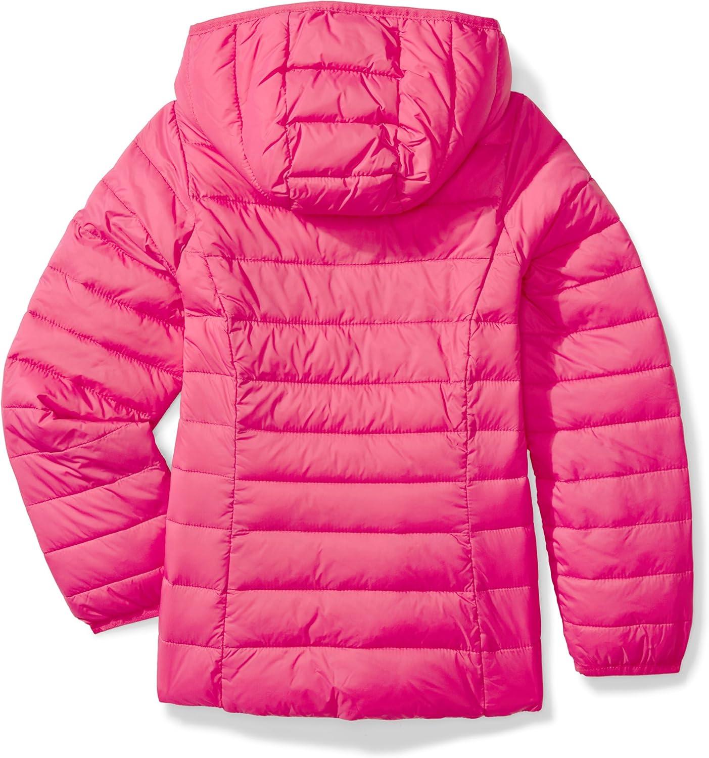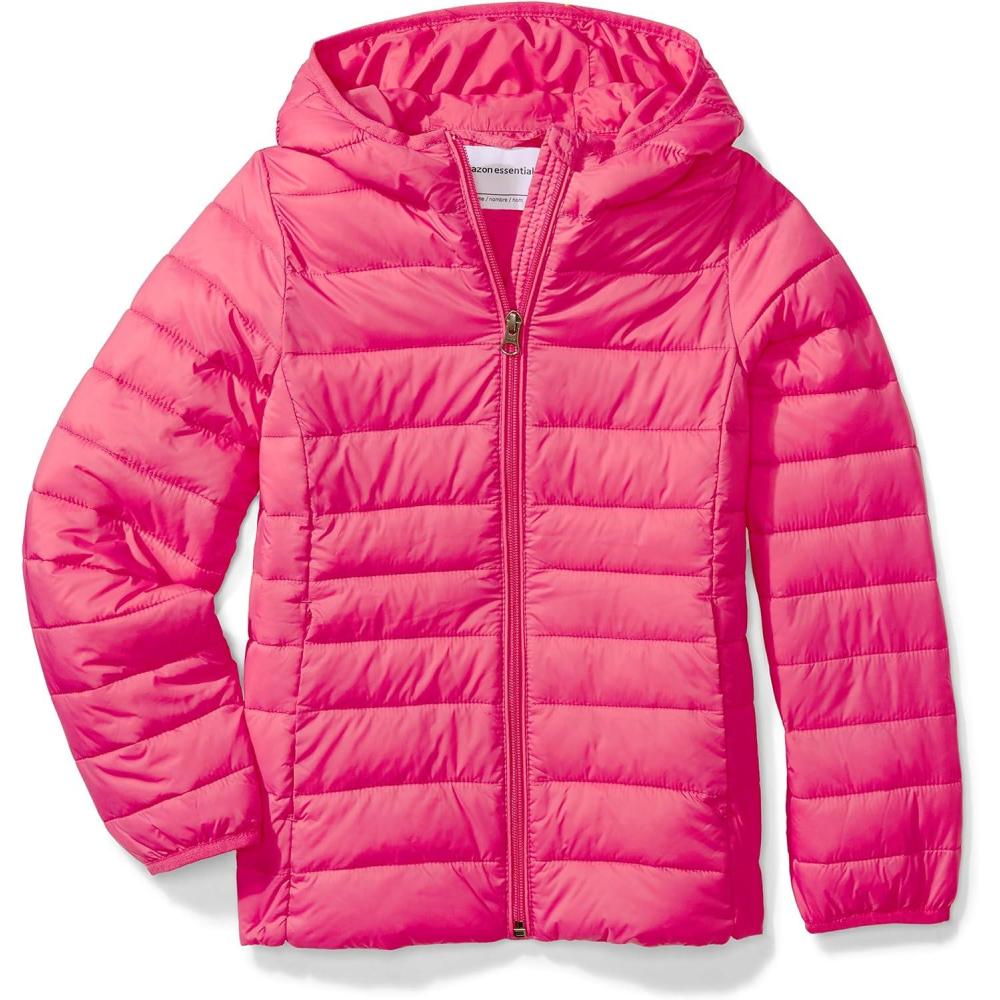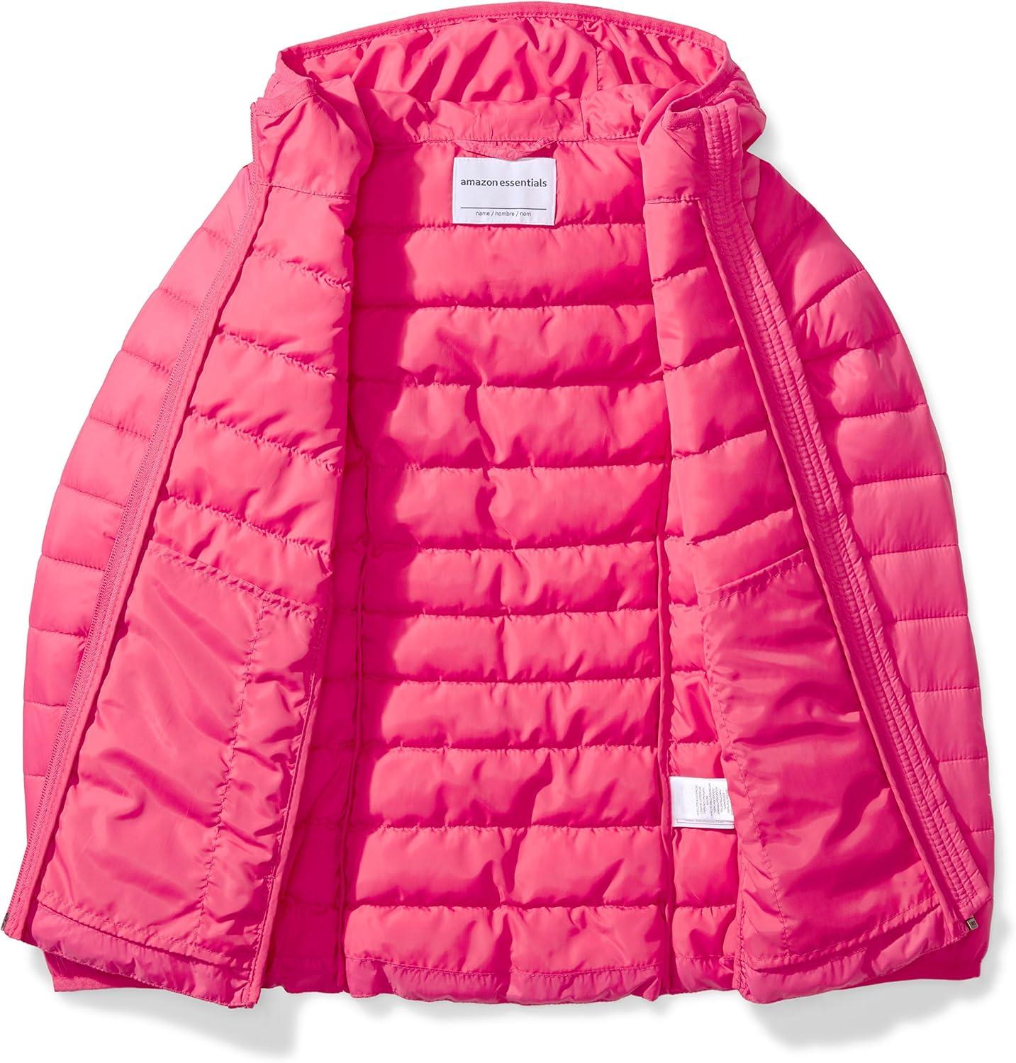 Amazon Essentials Girls and Toddlers’ Lightweight Water-Resistant Packable Hooded Puffer Jacket(Neon Pink)