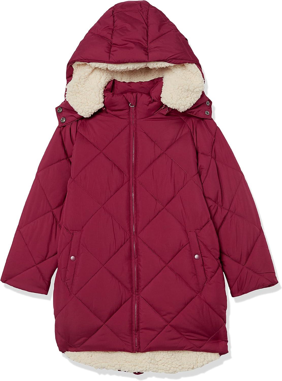 Amazon Essentials Girls and Toddlers’ Long Quilted Cocoon Puffer Coat(Ecru Raspberry Red Shearling)