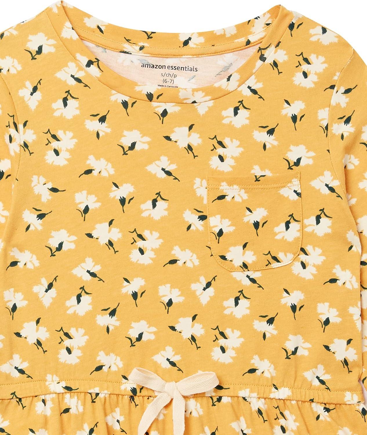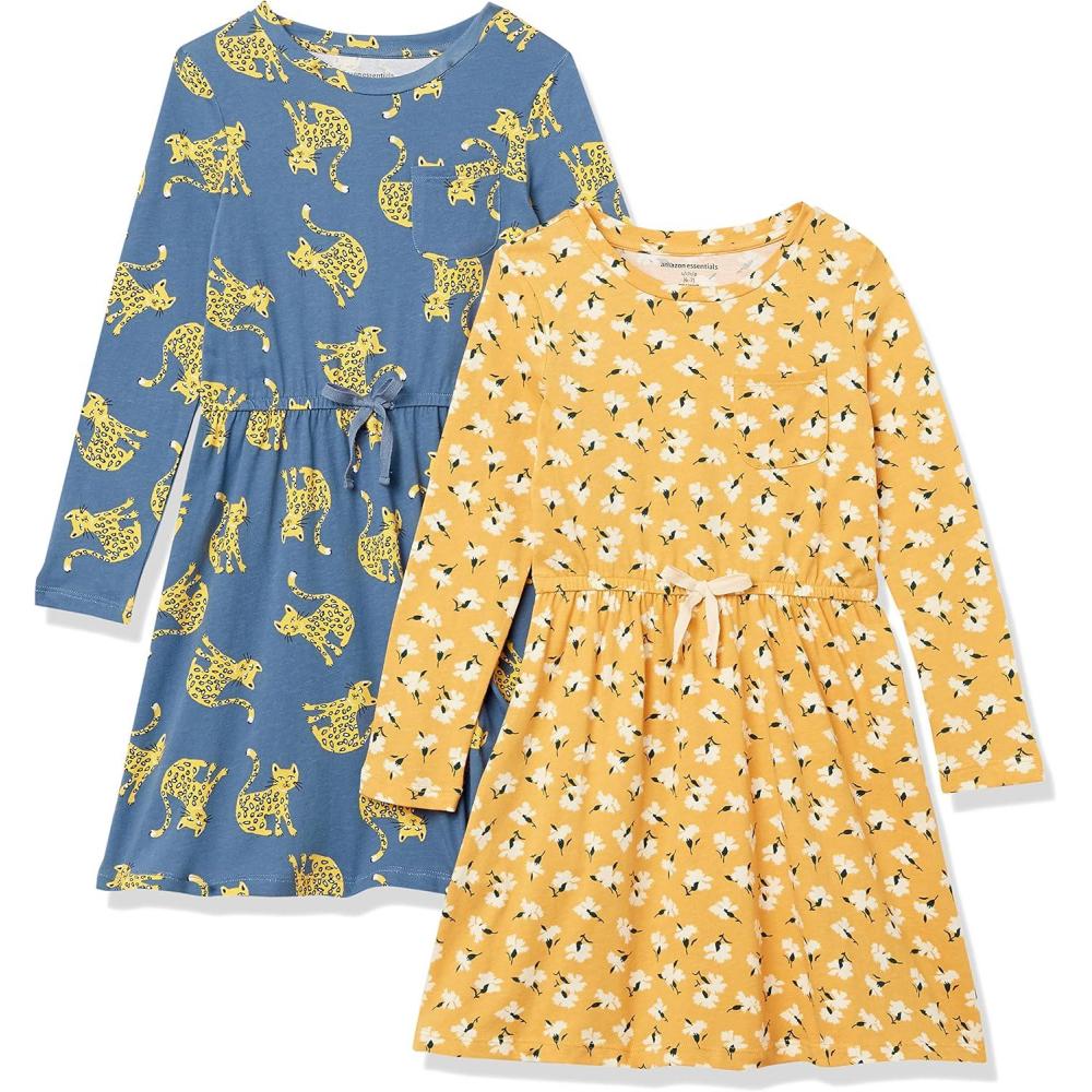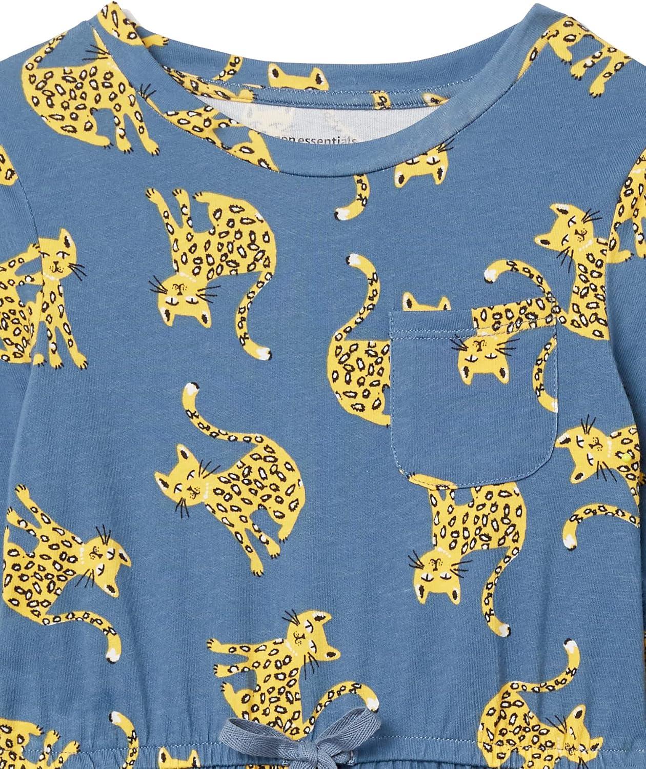 Amazon Essentials Girls and Toddlers’ Long-Sleeve Elastic Waist T-Shirt Dress(Blue Cat/Yellow Floral)
