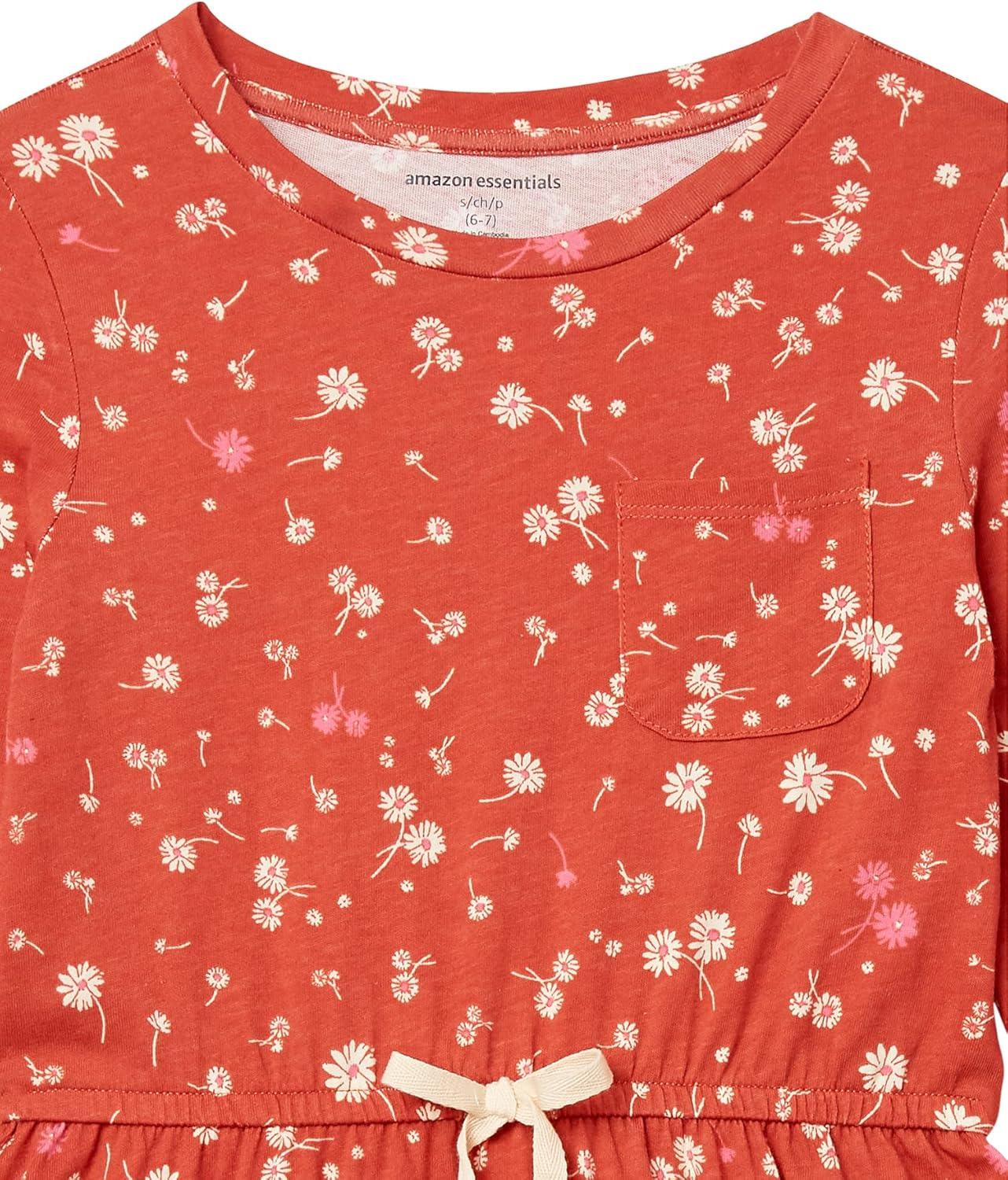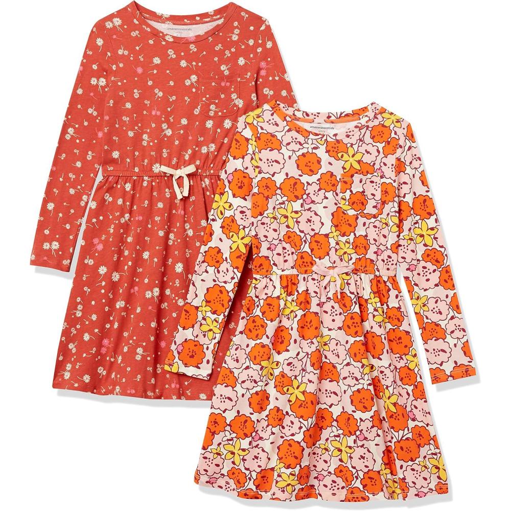 Amazon Essentials Girls and Toddlers’ Long-Sleeve Elastic Waist T-Shirt Dress(Orange Ditsy/Pink Floral)