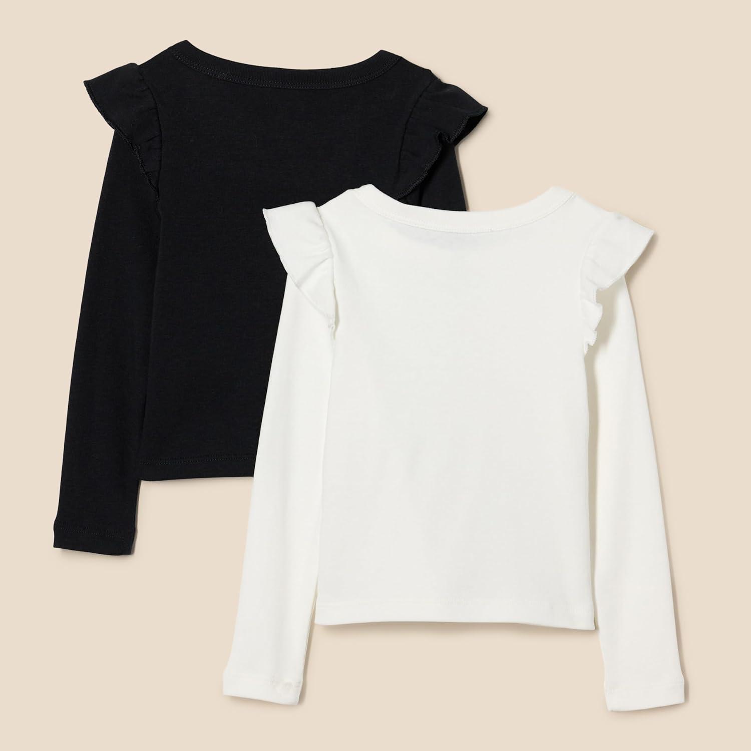 Amazon Essentials Girls and Toddlers' Long Sleeve Ruffle T-Shirt, Pack of 2(Black/Ivory)