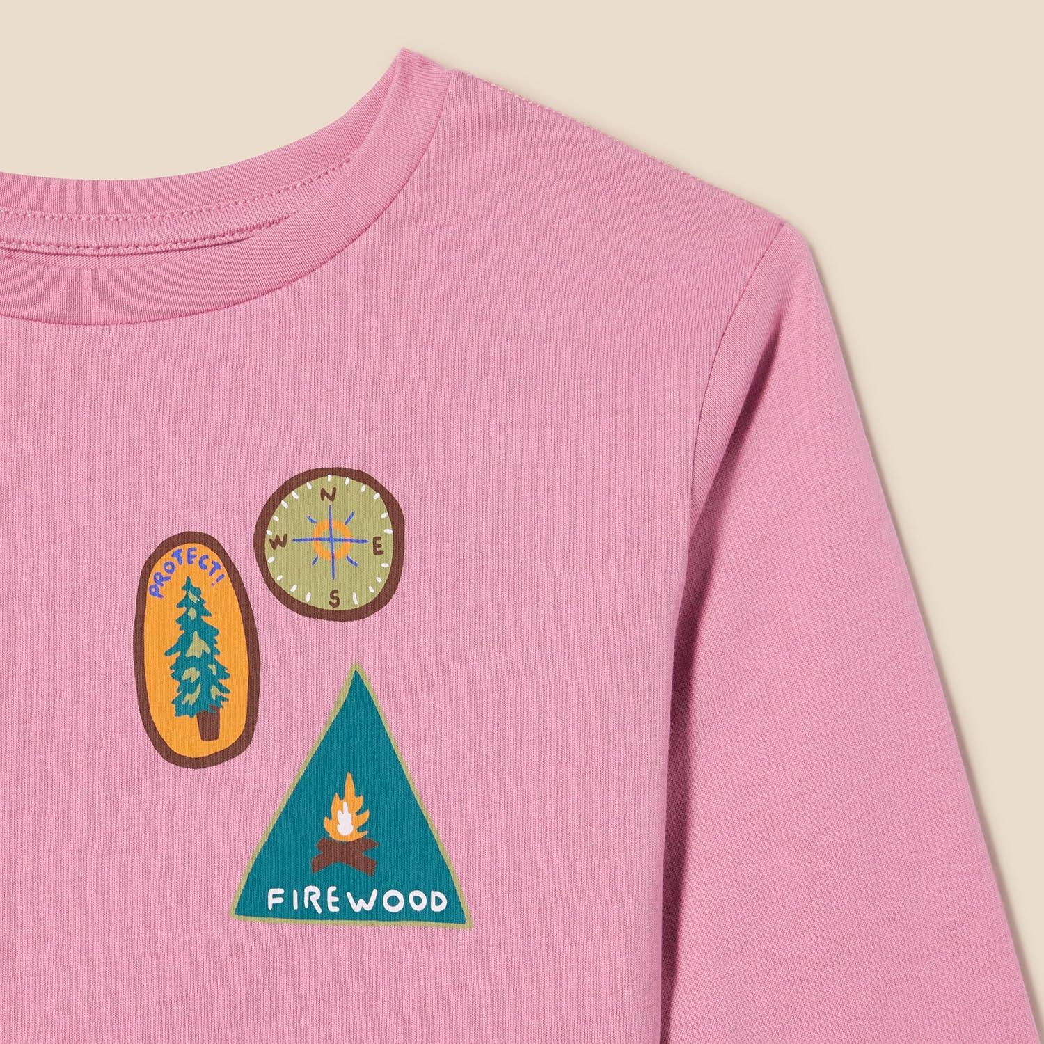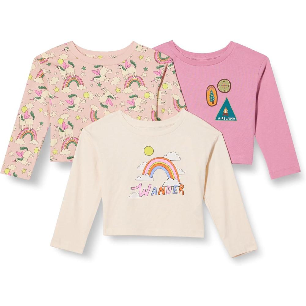 Amazon Essentials Girls and Toddlers’ Long Sleeve T Shirts, Pack of 3(Badges/Unicorn/Wander)
