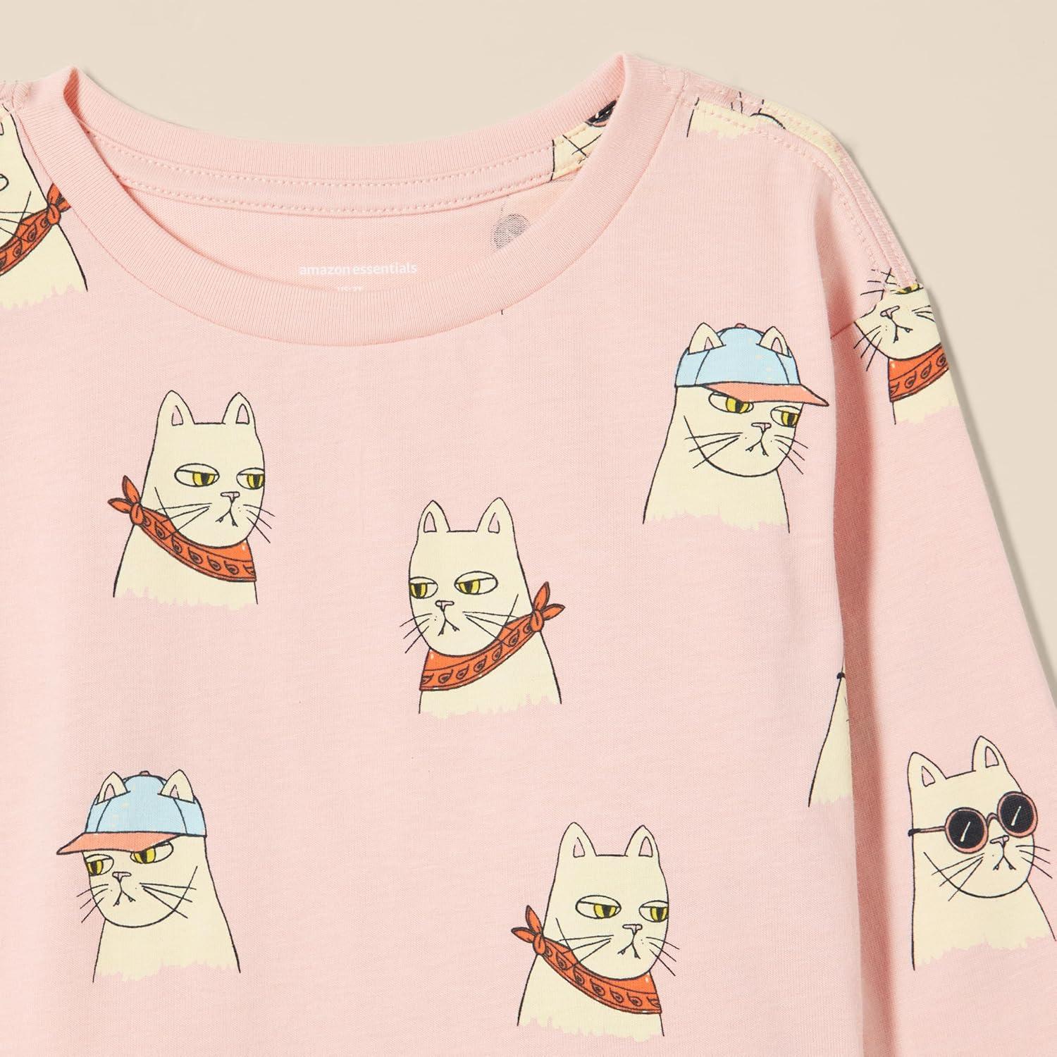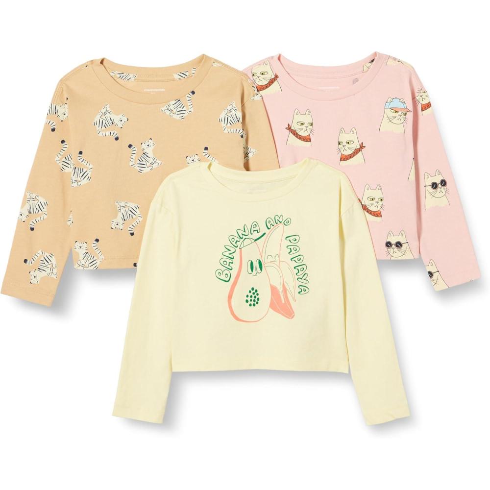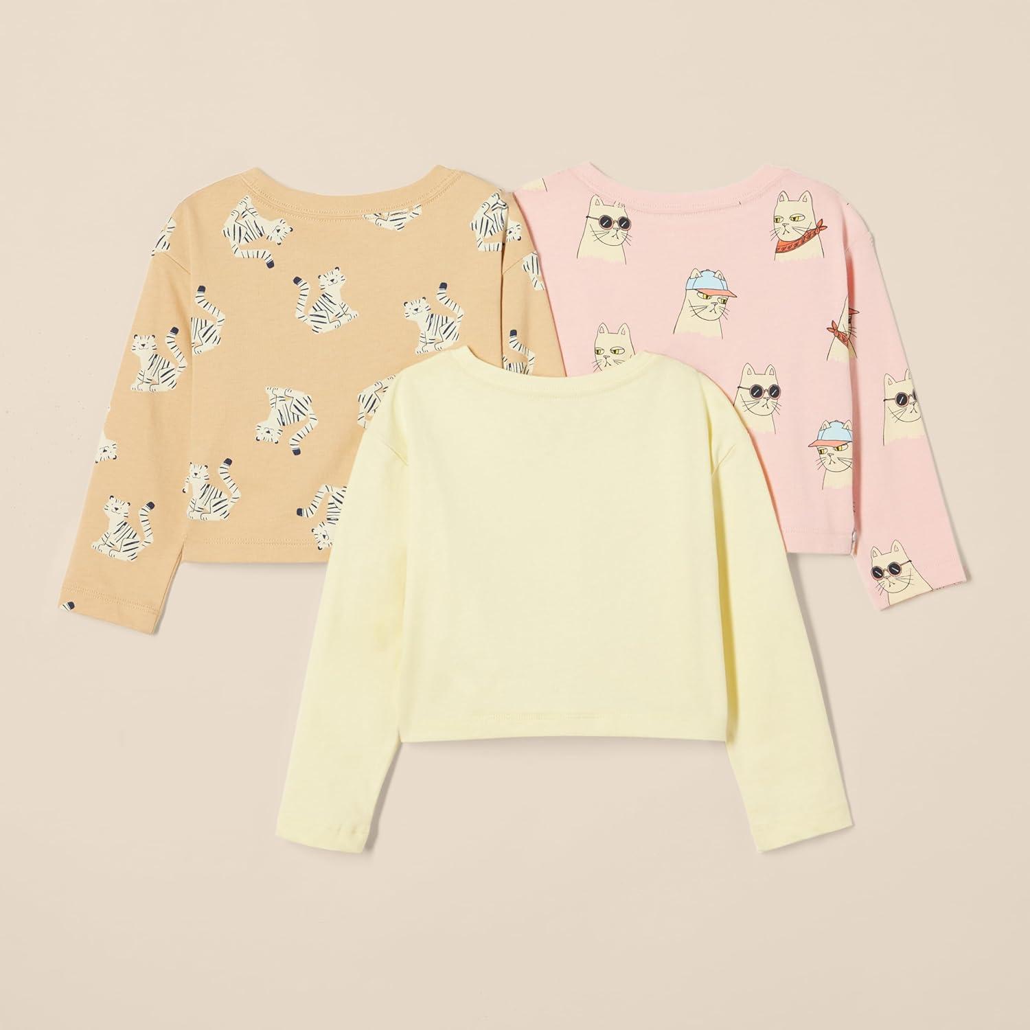 Amazon Essentials Girls and Toddlers’ Long Sleeve T Shirts, Pack of 3(Cool Cat/Tiger/Tropical Fruit)