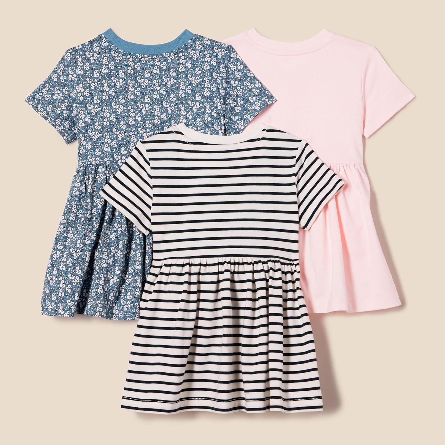 Amazon Essentials Girls and Toddlers’ Short Sleeve Jersey Dress, Pack of 3(Pale Pink/French Stripe/Floral)