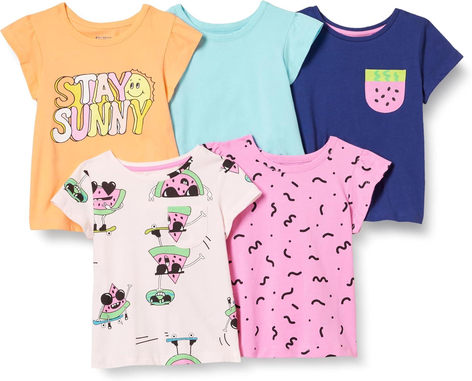 Amazon Essentials Girls and Toddlers’ Short-Sleeve T-Shirts, Multipacks(Aqua Blue/Ecru/Light Orange/Navy Color Block/Pink)