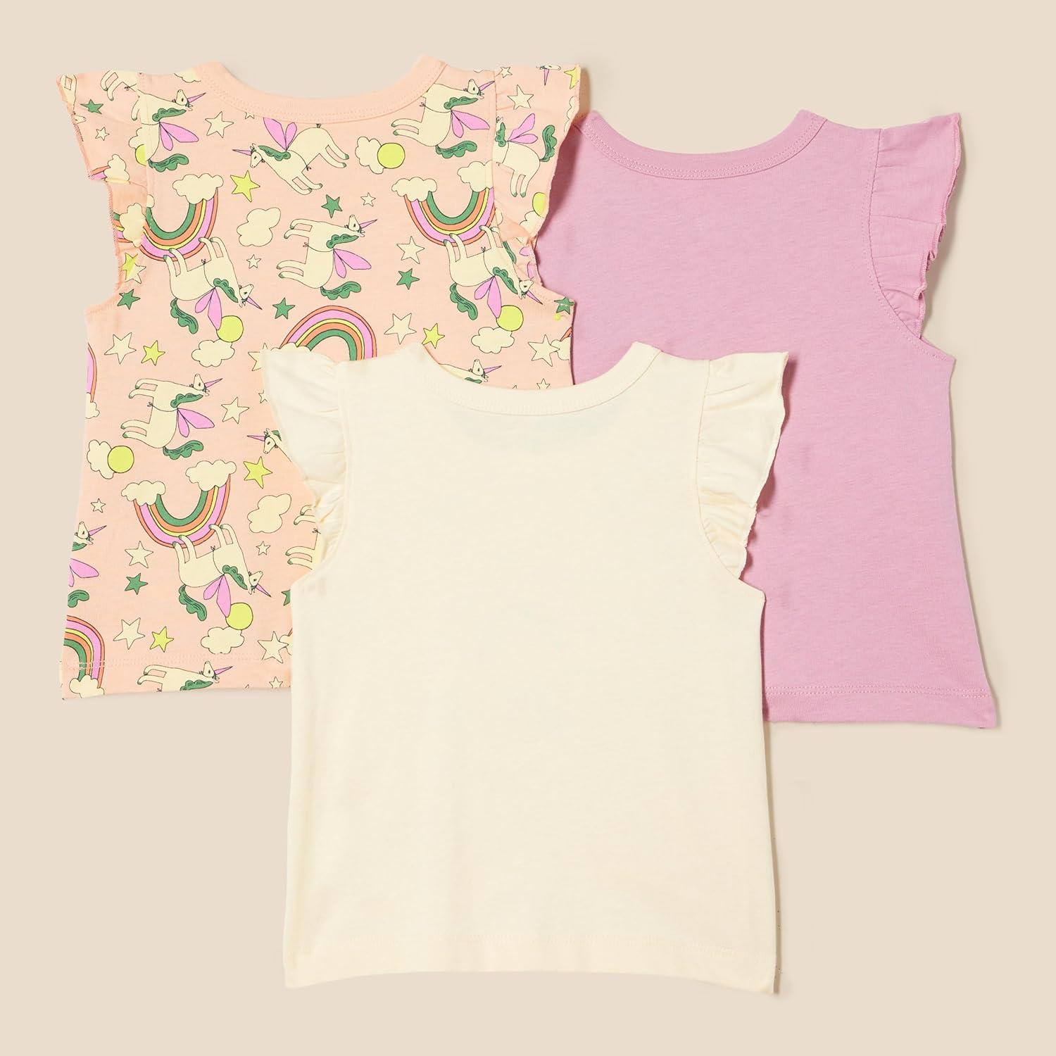 Amazon Essentials Girls and Toddlers’ Sleeveless Ruffle T-Shirt, Pack of 3(Badges/Unicorn/Wander)