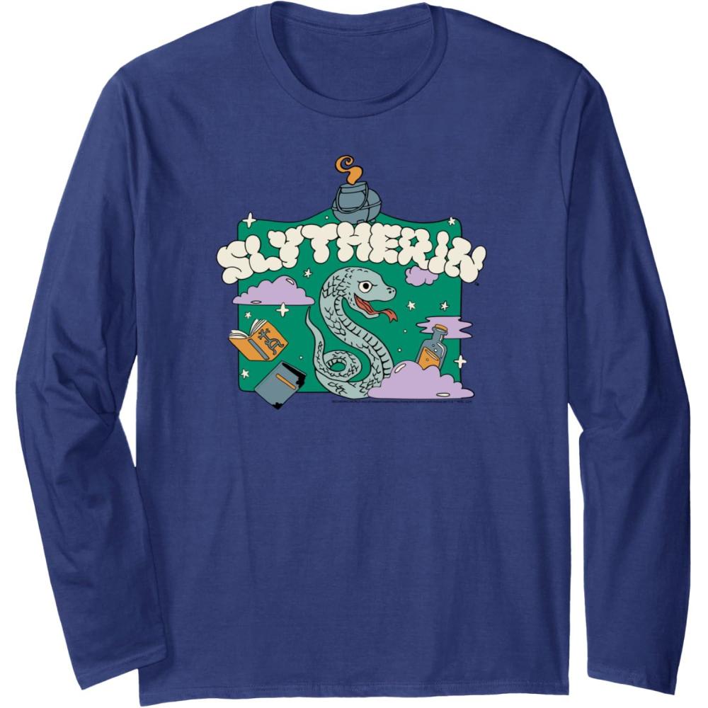 Amazon Essentials Harry Potter Hogwarts Slytherin House Cartoon Scene Long Sleeve T-Shirt(Navy Blue)