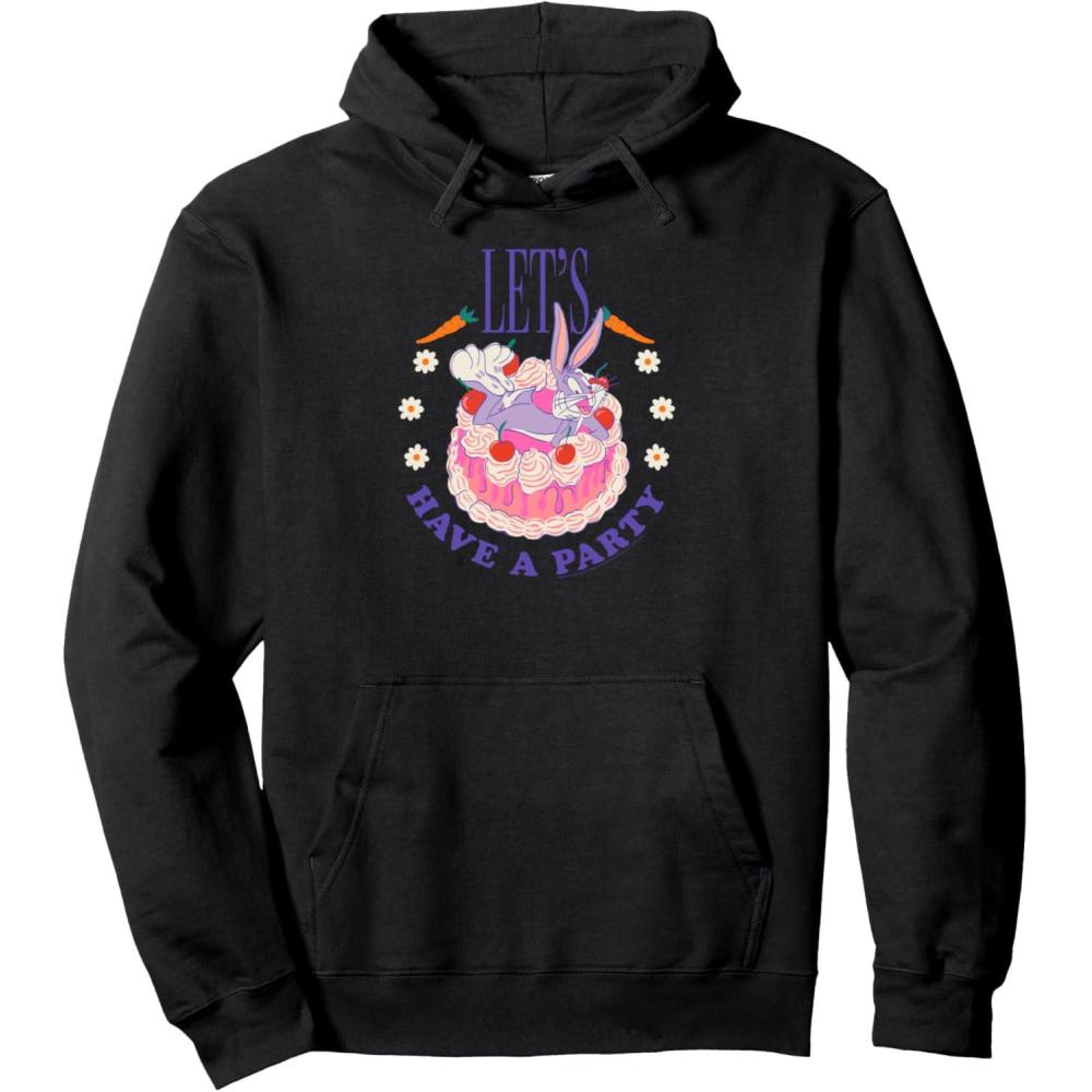 Amazon Essentials Looney Tunes Bugs Bunny Let’s Have A Party Cake Pullover Hoodie(Black)