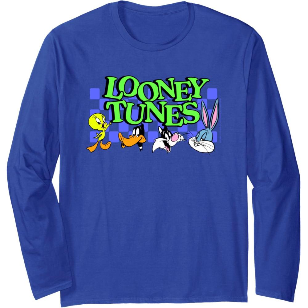 Amazon Essentials Looney Tunes Checkerboard with Characters Long Sleeve T-Shirt(Royal Blue)