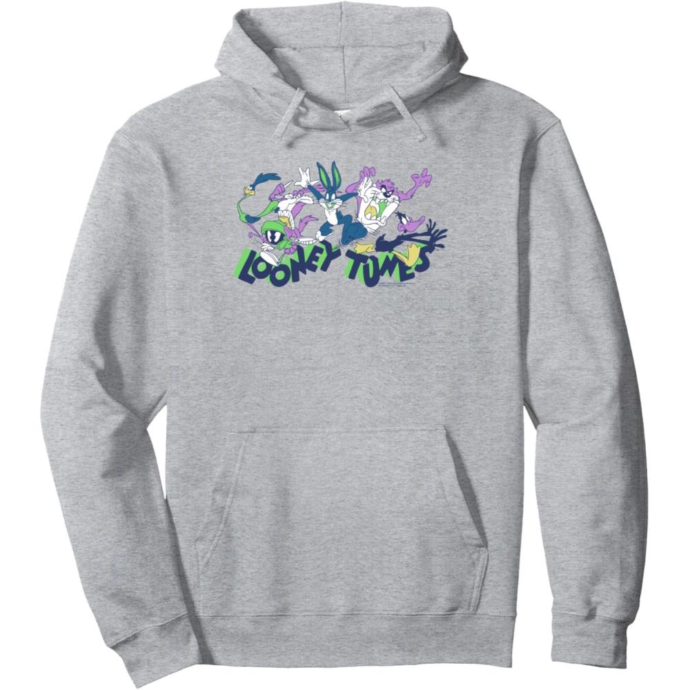 Amazon Essentials Looney Tunes Green Logo with Running Characters Pullover Hoodie(Heather Grey)