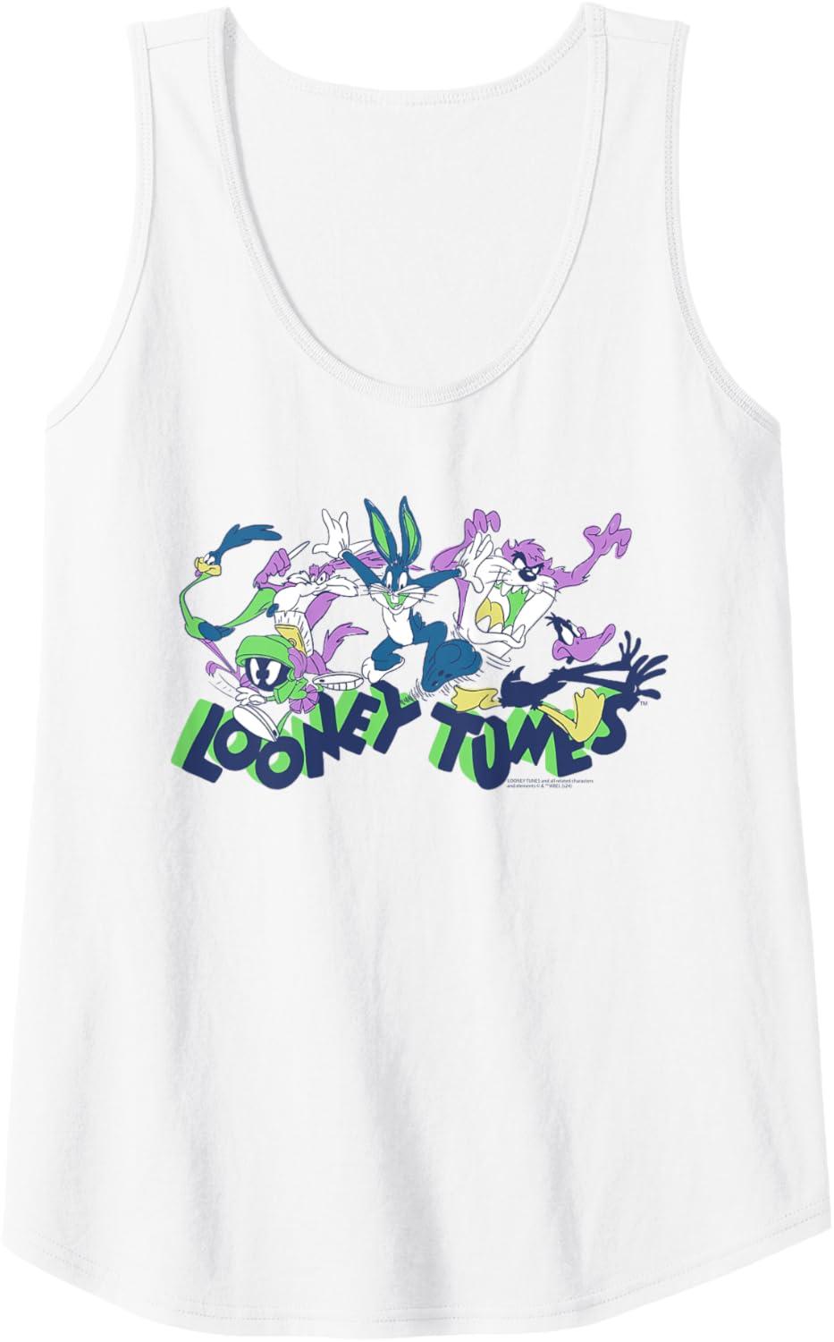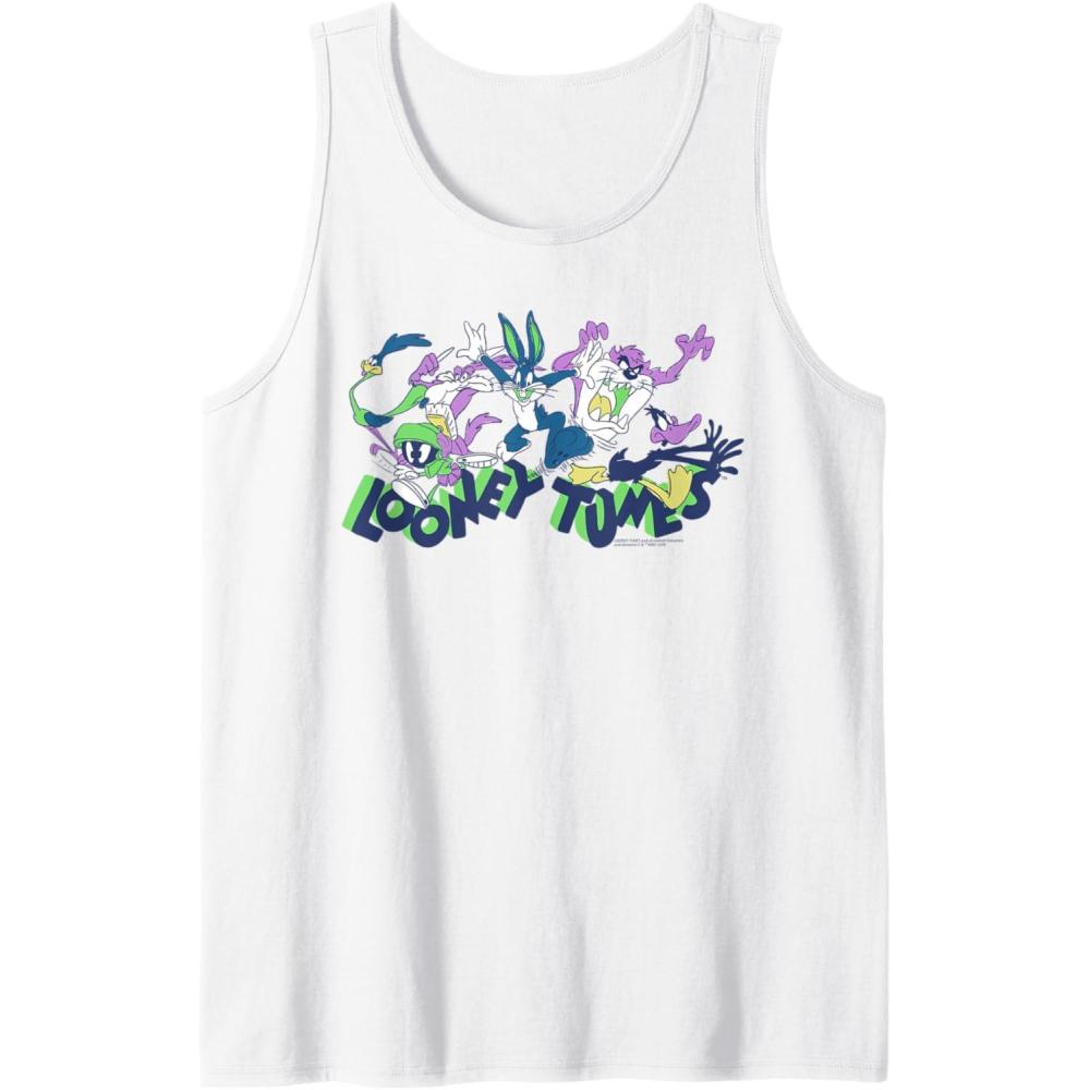 Amazon Essentials Looney Tunes Green Logo with Running Characters Tank Top(White)