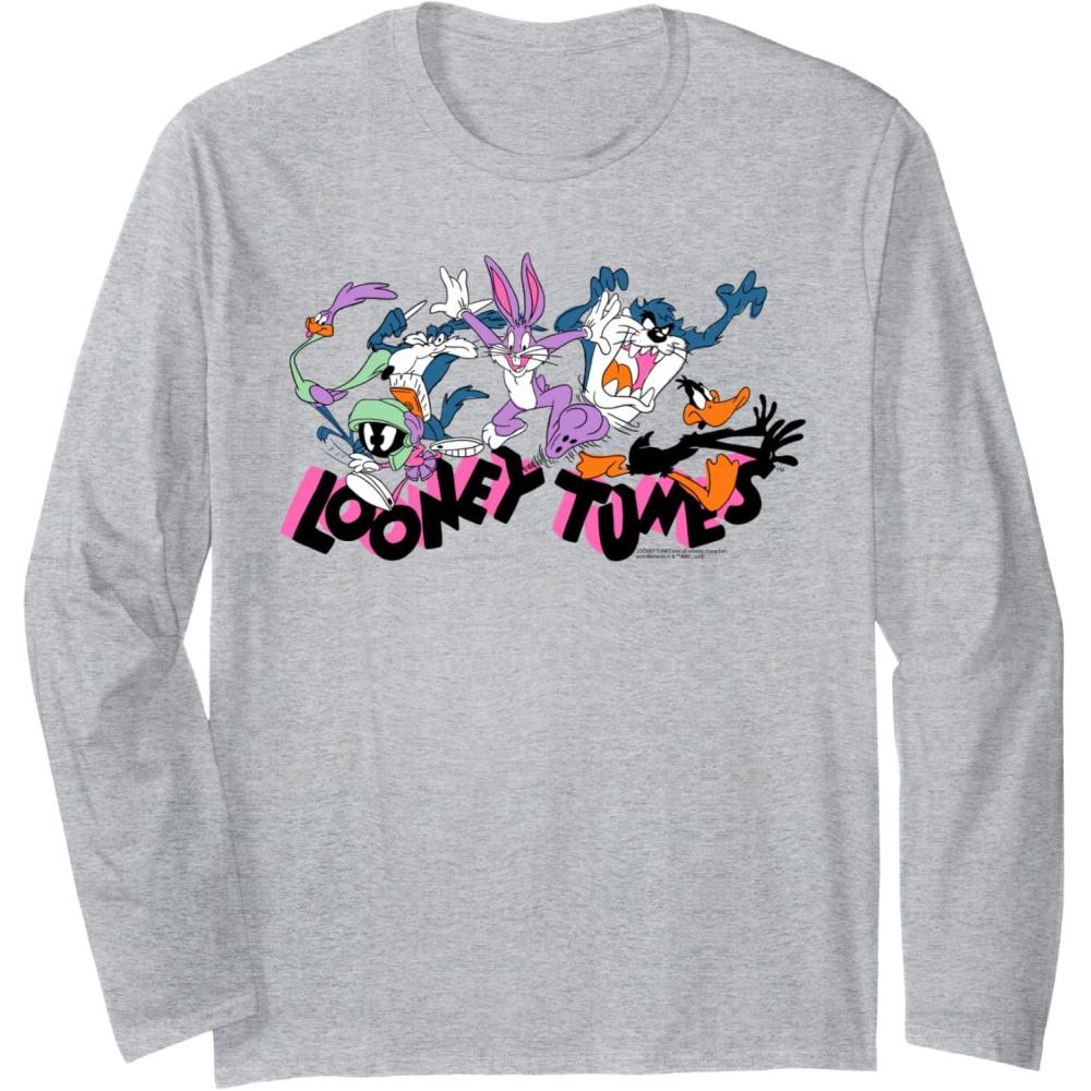 Amazon Essentials Looney Tunes Pink Logo with Running Characters Long Sleeve T-Shirt(Heather Grey)