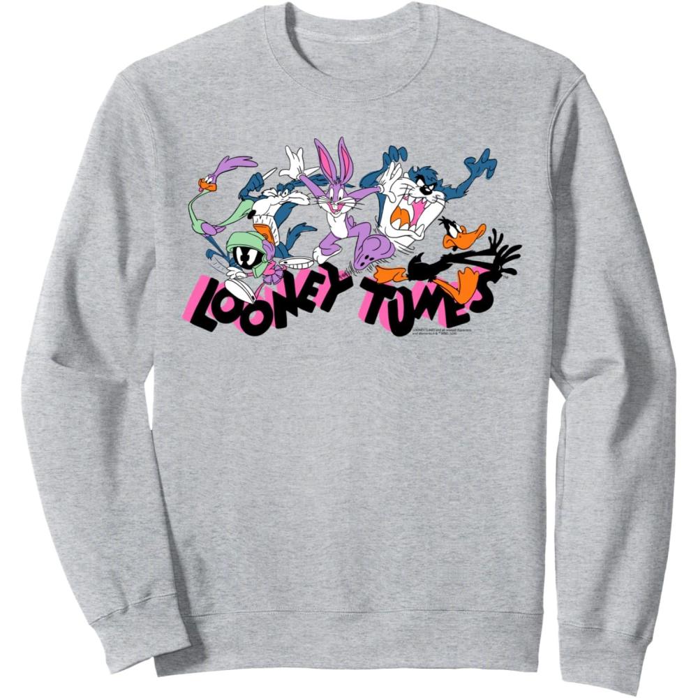 Amazon Essentials Looney Tunes Pink Logo with Running Characters Sweatshirt(Heather Grey)