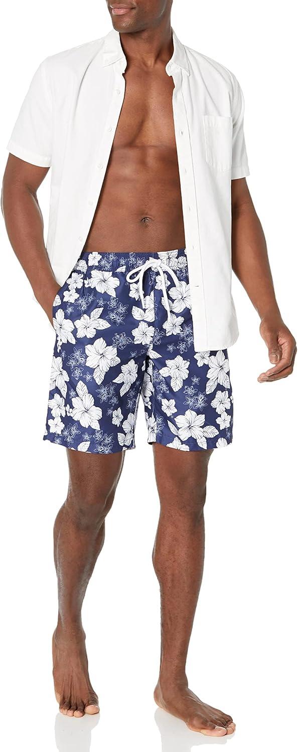 Amazon Essentials Men's 9" Swim Trunks with Mesh Lining, Pockets, Drawstring Closure(Navy Hibiscus Flower)