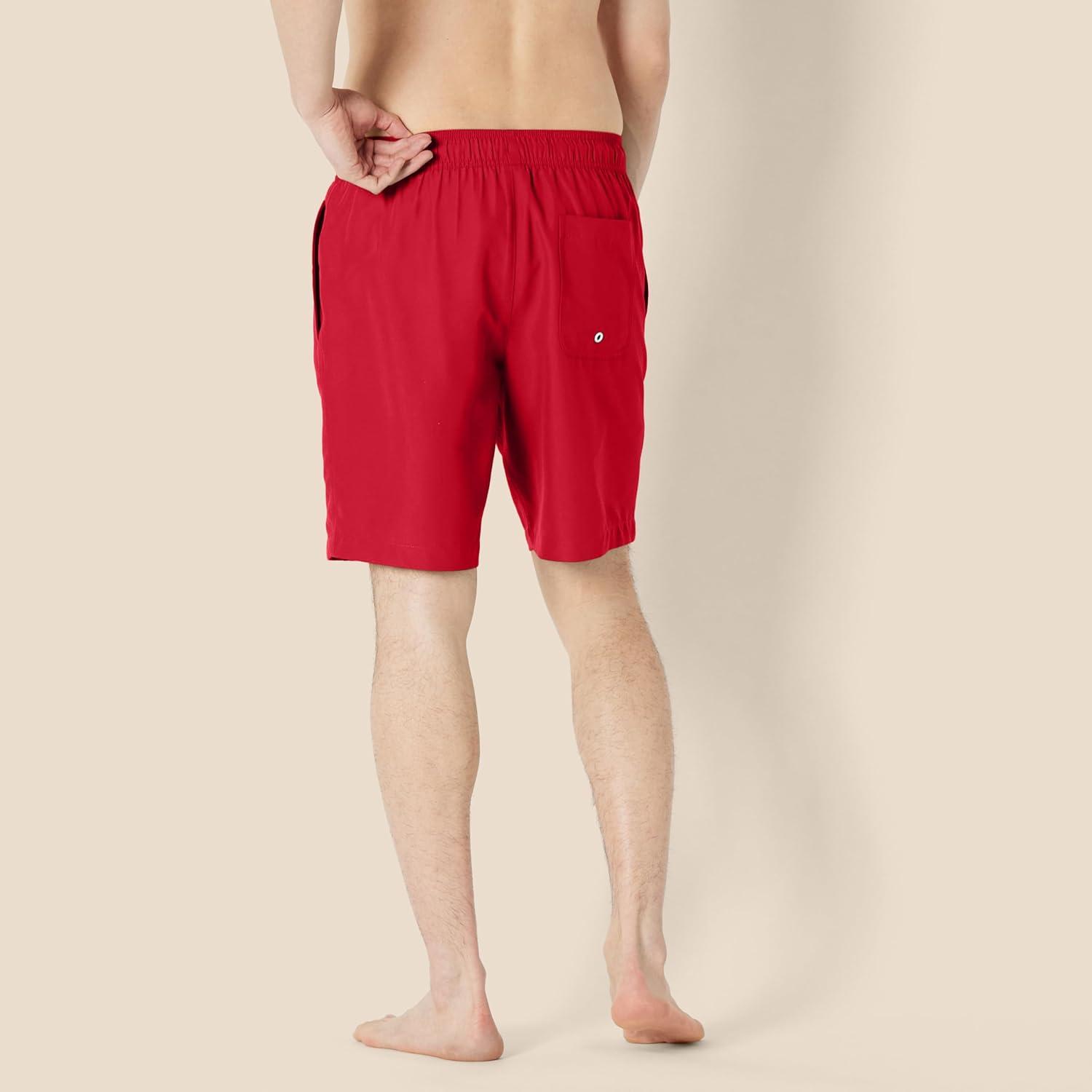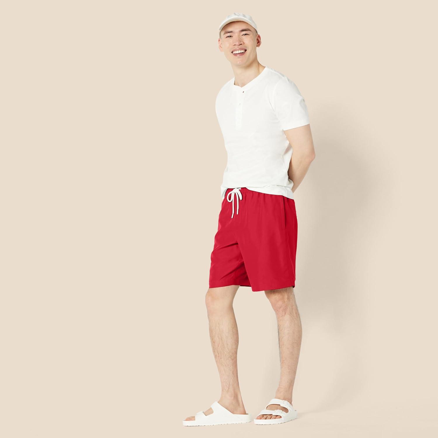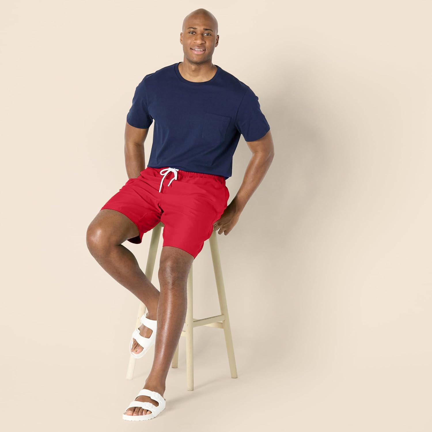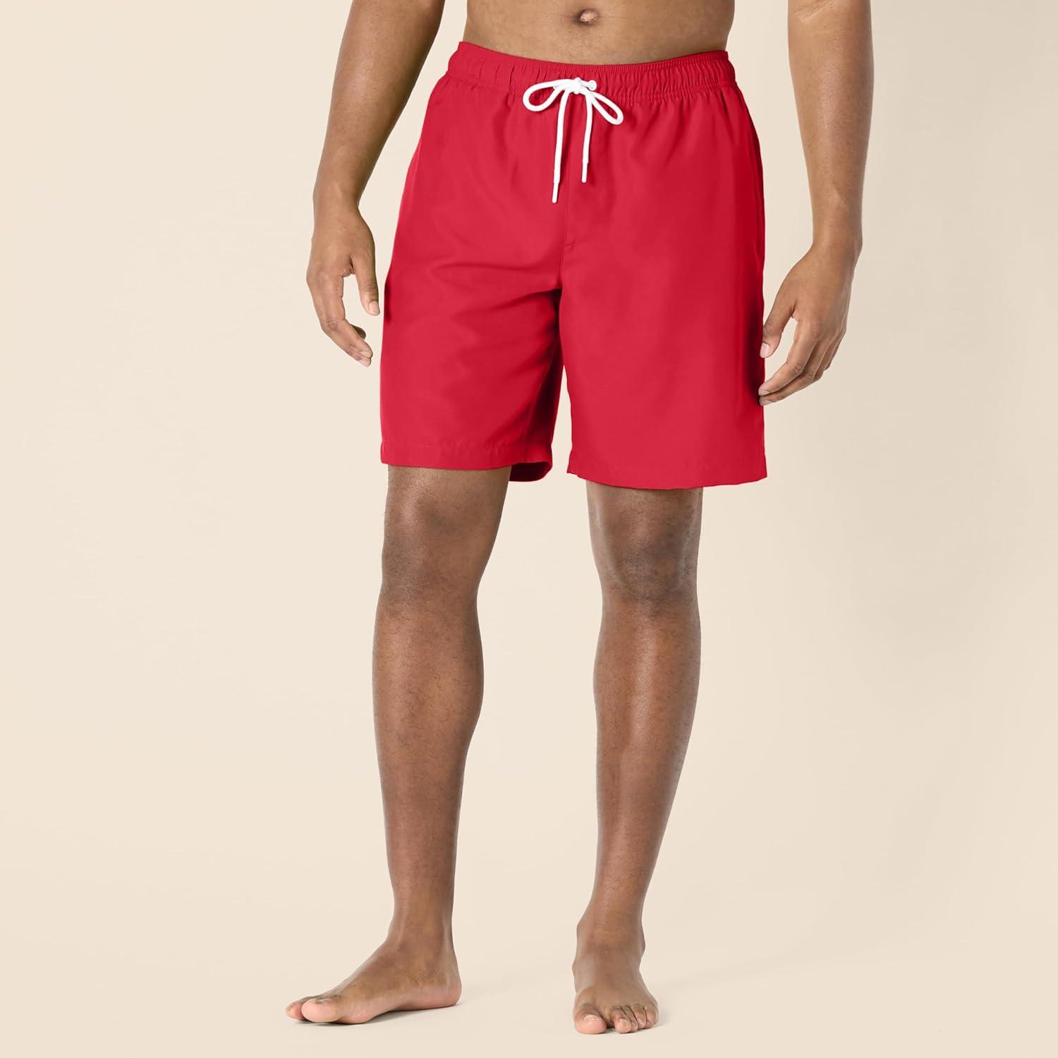 Amazon Essentials Men’s 9″ Swim Trunks with Mesh Lining, Pockets, Drawstring Closure(Red)