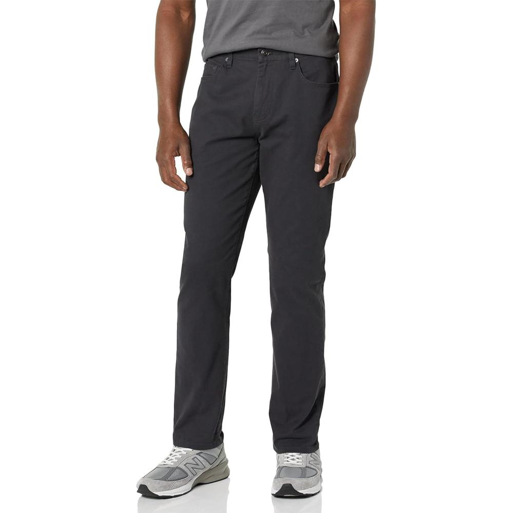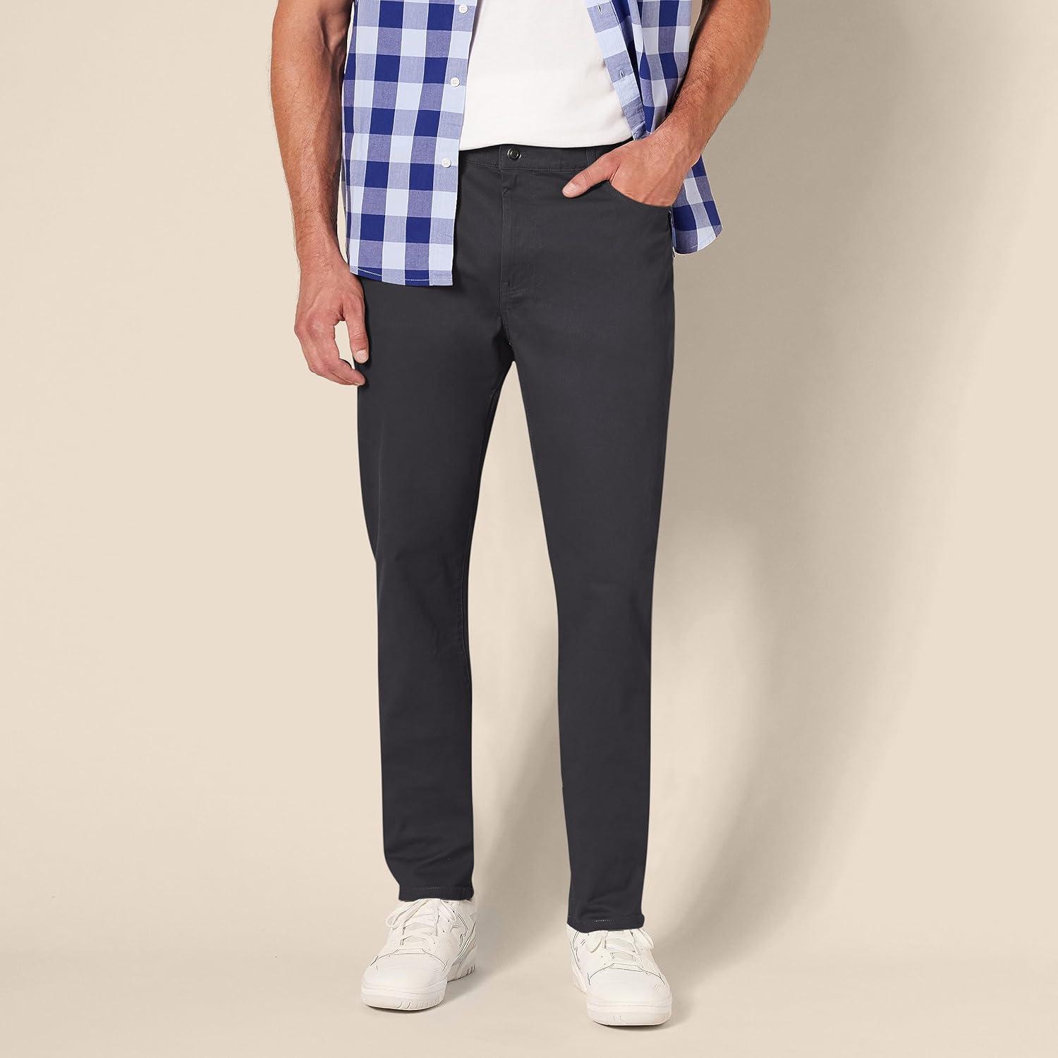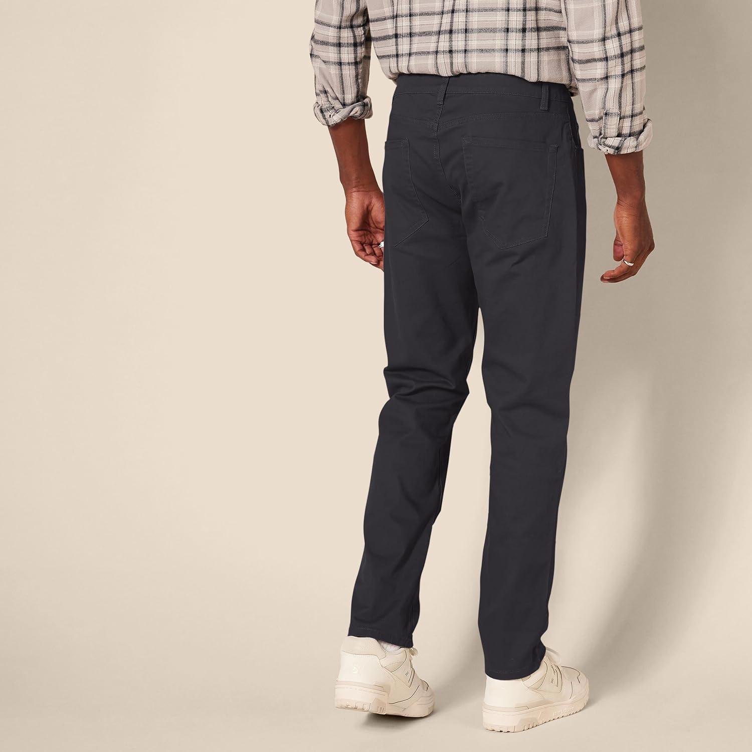 With an athletic fit, these men's casual pants are crafted to offer extra room in the hip and thigh, sitting comfortably at the waist for a flattering silhouette. The stretch pants for men are made from high-quality stretch cotton twill, providing ease of movement and a fit that adapts to your daily activities. These men work pants come in a classic, jeans-inspired 5-pocket style, making them great for both casual outings and more formal occasions. Whether you're heading to the office or enjoying a leisurely day, these casual pants for men offer the versatility you need. Details such as a shank button closure, rivets, and a zipper fly provide durability and a polished look. At Amazon Essentials, we pride ourselves on delivering reliable, high-quality, and affordable apparel that fits seamlessly into your lifestyle. Our consistent sizing and attention to detail mean you can shop with confidence, knowing that every piece is designed to meet the highest standards of comfort and fashion. Our essential pants for men will elevate your daily wardrobe effortlessly.