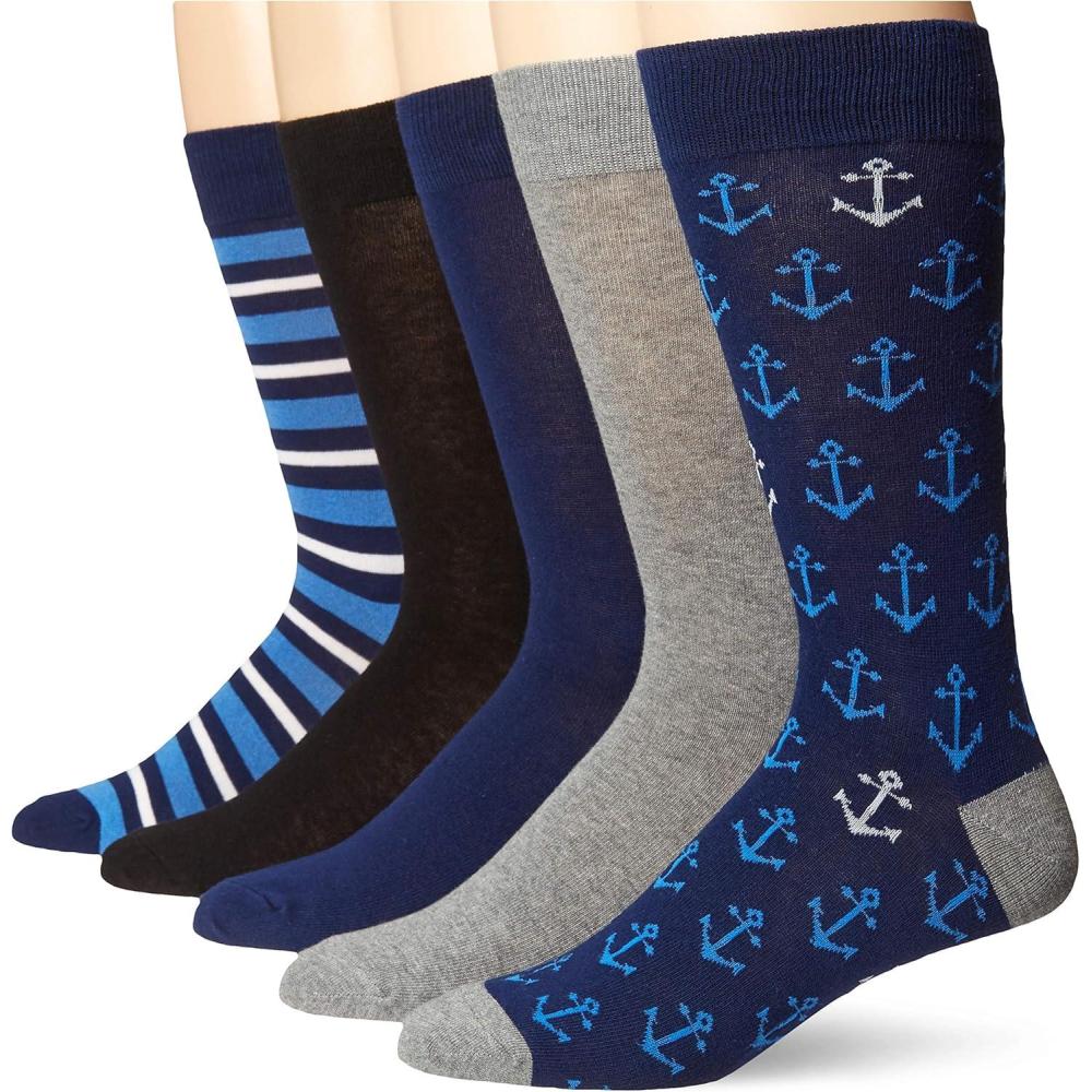 Amazon Essentials Mens Comfortable Patterned Dress Socks, 5 Pairs(Anchor/Stripe)