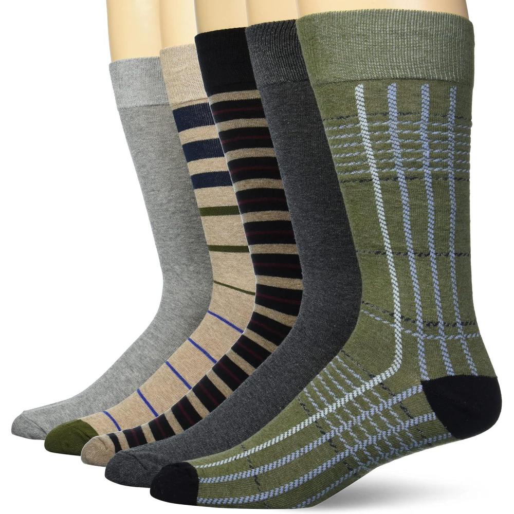 Amazon Essentials Mens Comfortable Patterned Dress Socks, 5 Pairs(Black/Brown/Dark Grey/Green/Grey)