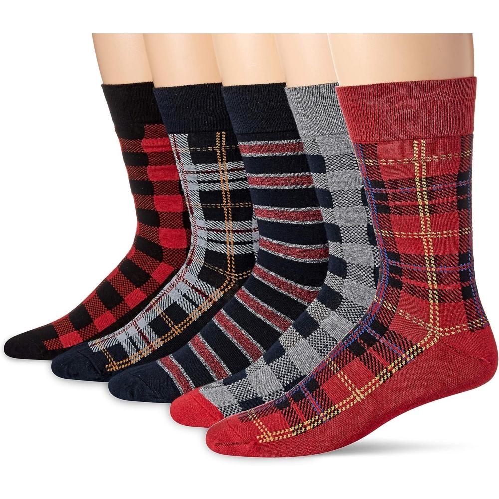 Amazon Essentials Mens Comfortable Patterned Dress Socks, 5 Pairs(Plaid/Stripe)