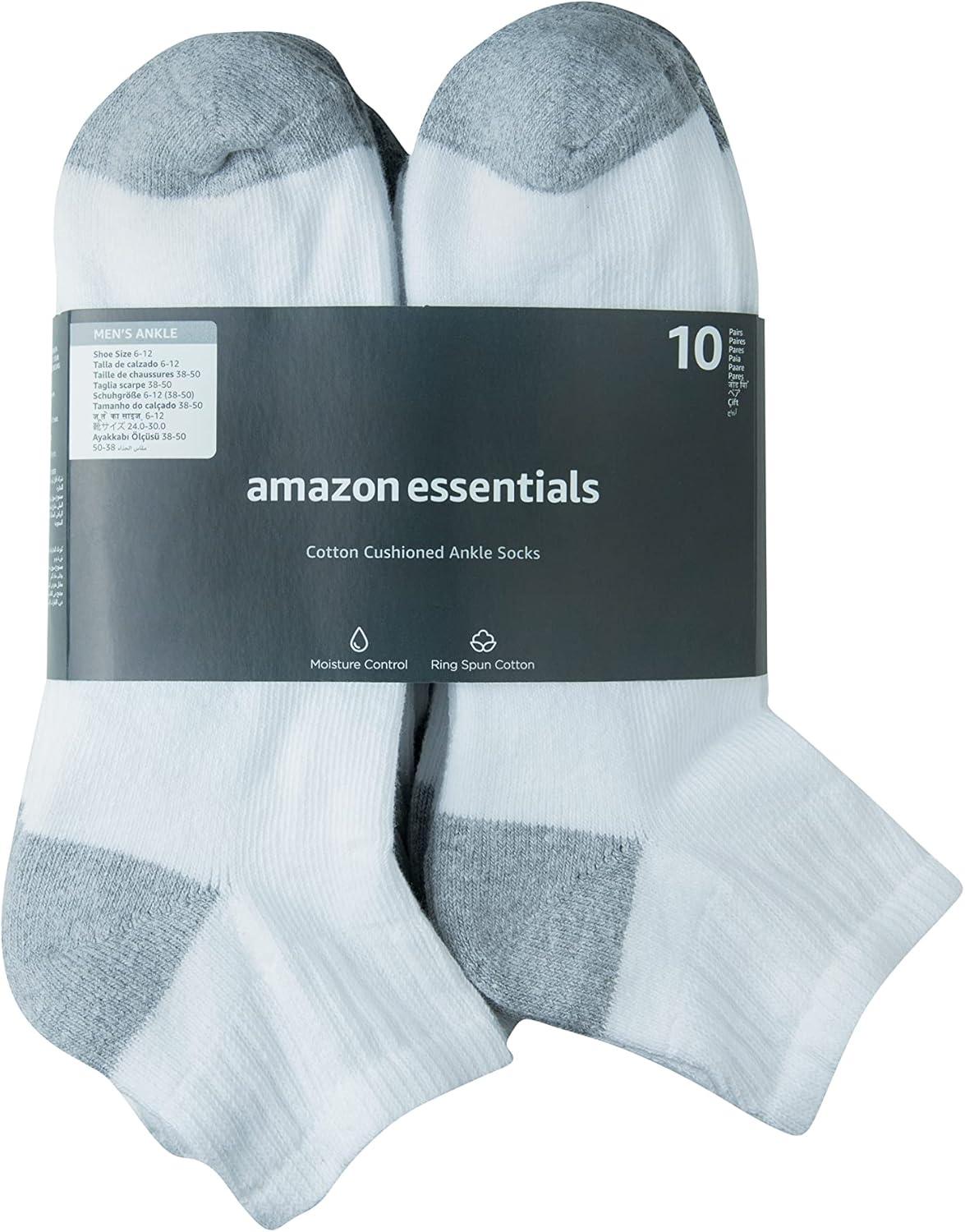 Amazon Essentials Men’s Cotton Ankle Socks, Comfortable, Moisture Wicking, Cushioned, 10 Pairs(White)