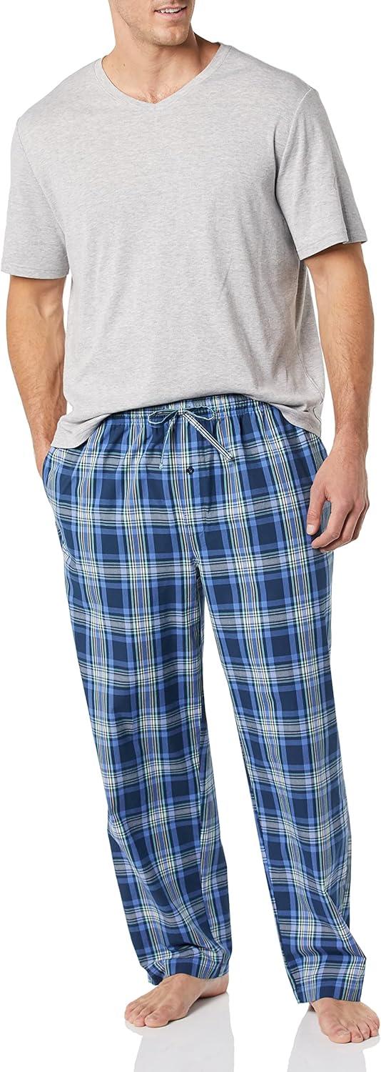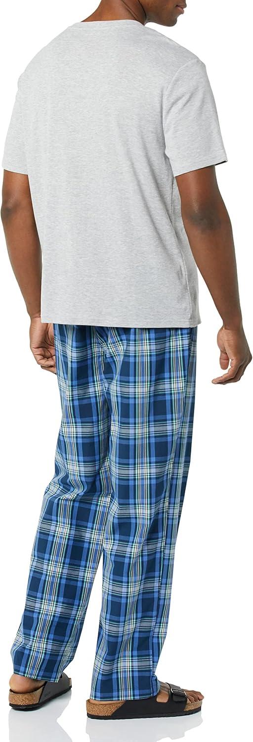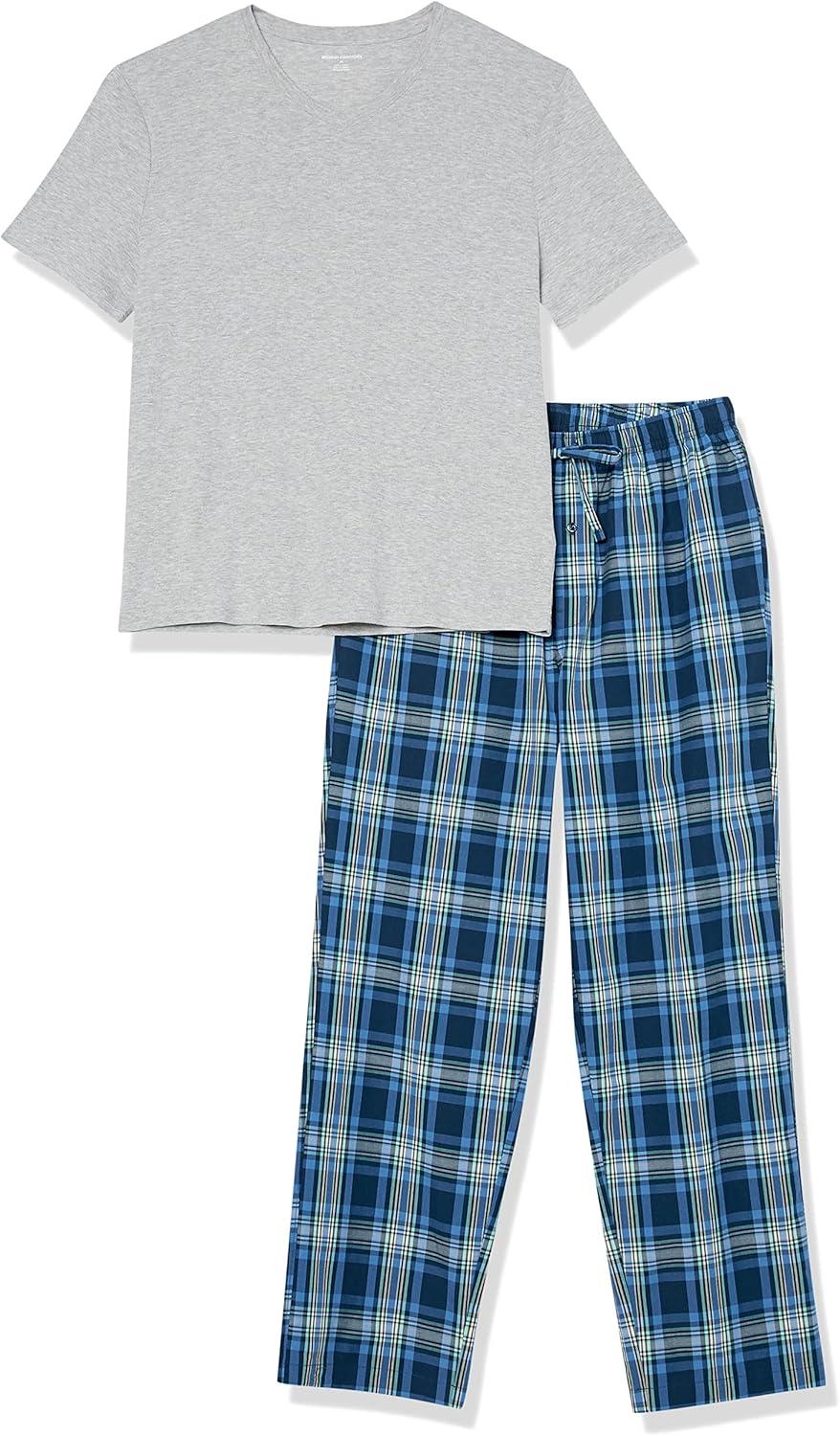 Amazon Essentials Men’s Cotton Poplin Pant with Cotton Jersey T-Shirt Pajama Set(Grey Heather/Navy Plaid)