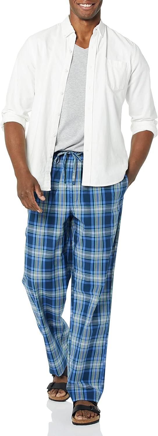 Amazon Essentials Men’s Cotton Poplin Pant with Cotton Jersey T-Shirt Pajama Set(Indigo/Navy Plaid)