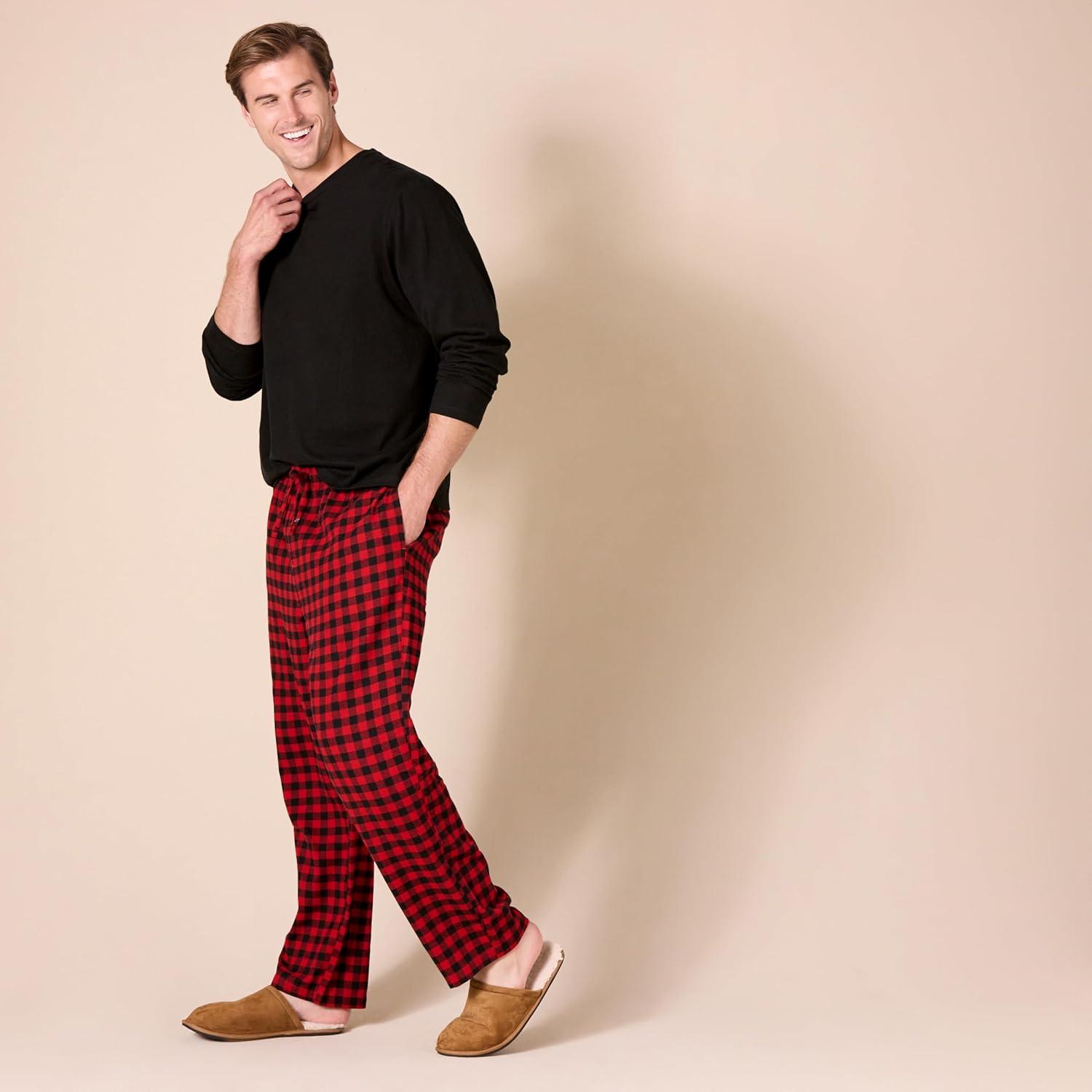 Amazon Essentials Men's Flannel Pant and Long-Sleeve T-Shirt Pajama Set(Black and Classic Buffalo Check)
