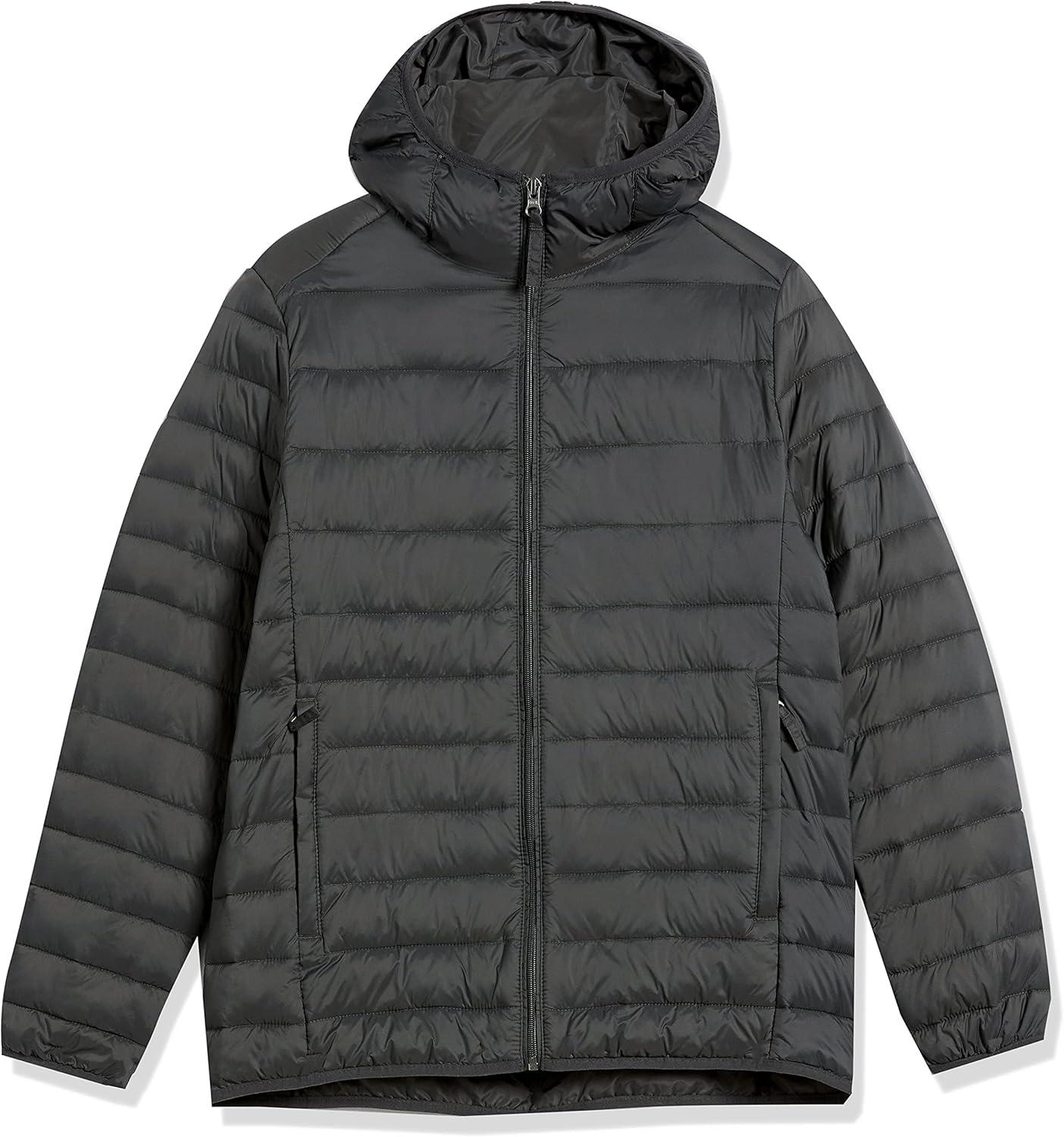 Amazon Essentials Men's Lightweight Water-Resistant Packable Hooded Puffer Jacket(Dark Grey)