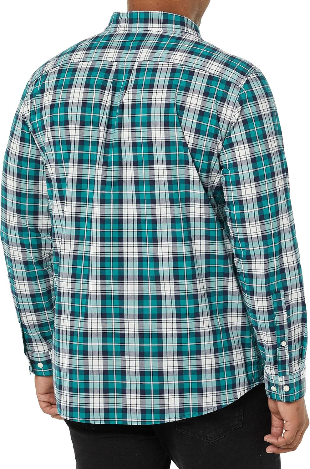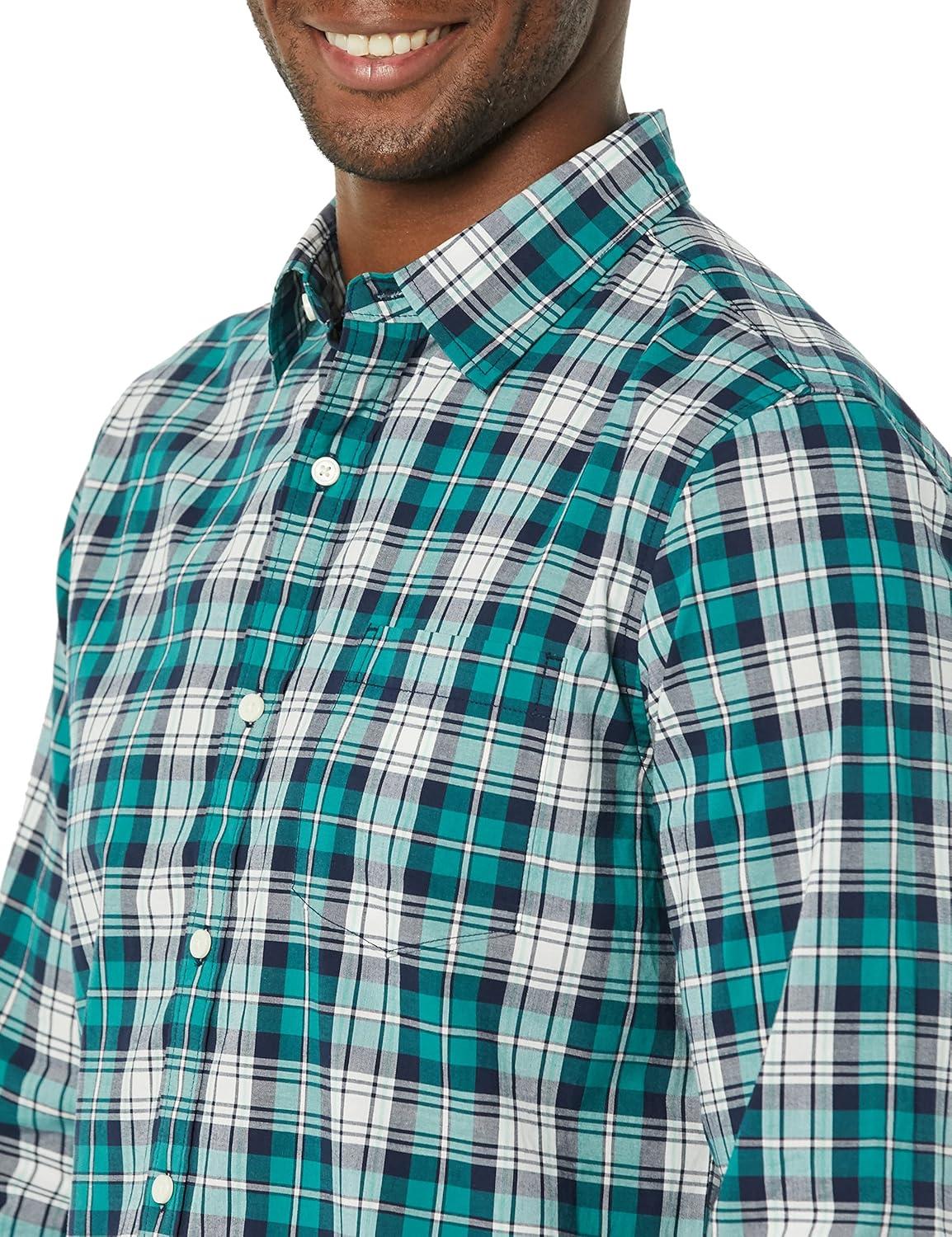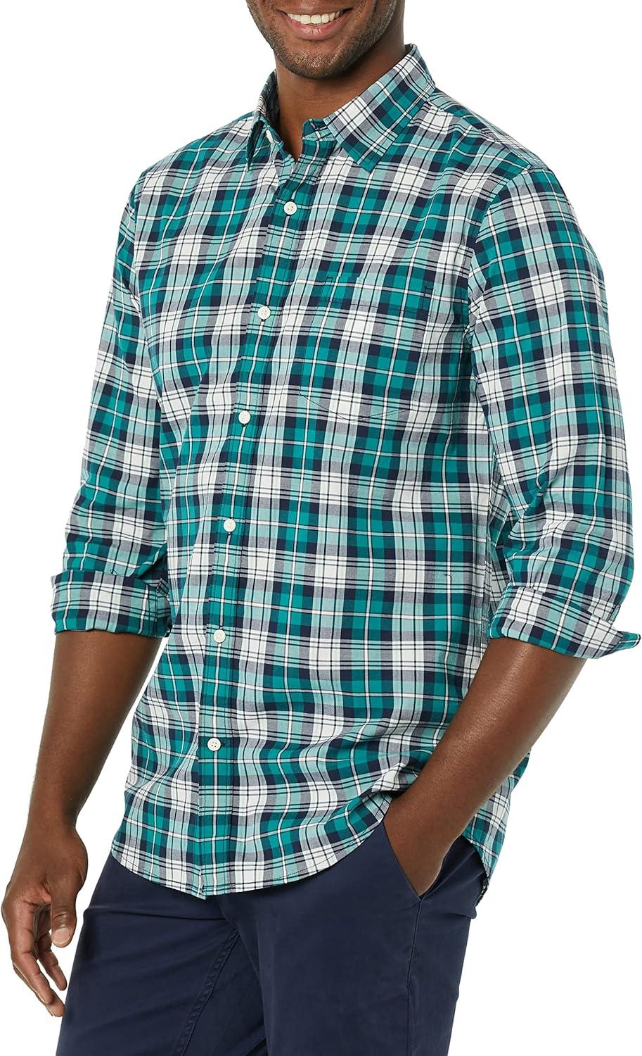 Amazon Essentials Men’s Long-Sleeve Slim-Fit Stretch Poplin Shirt(Teal Blue White Plaid)