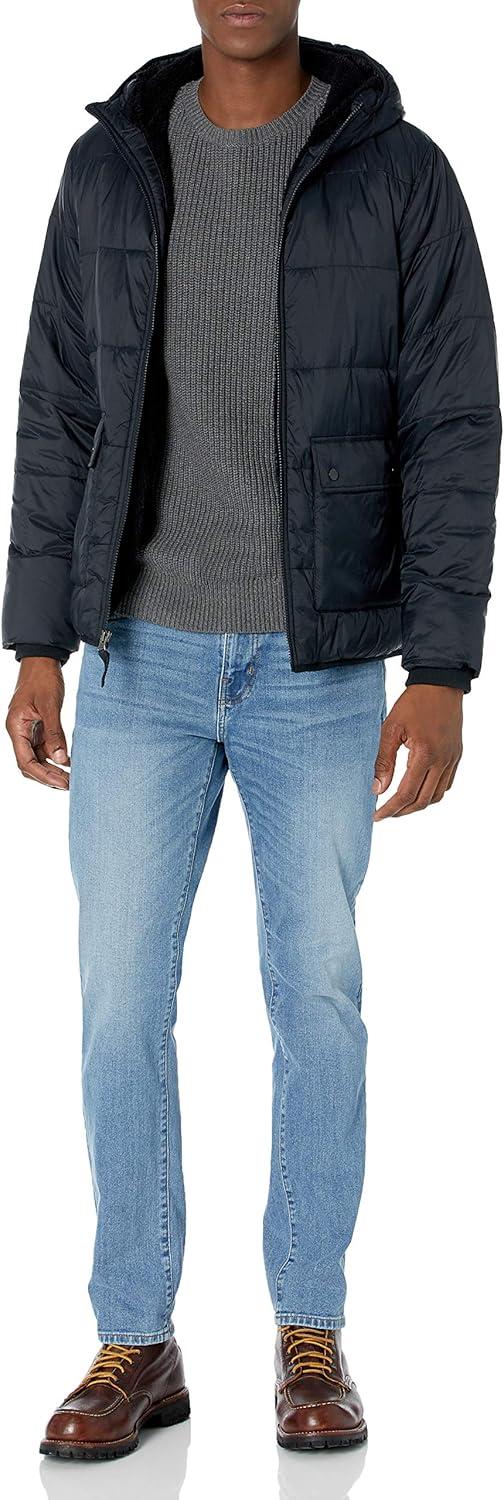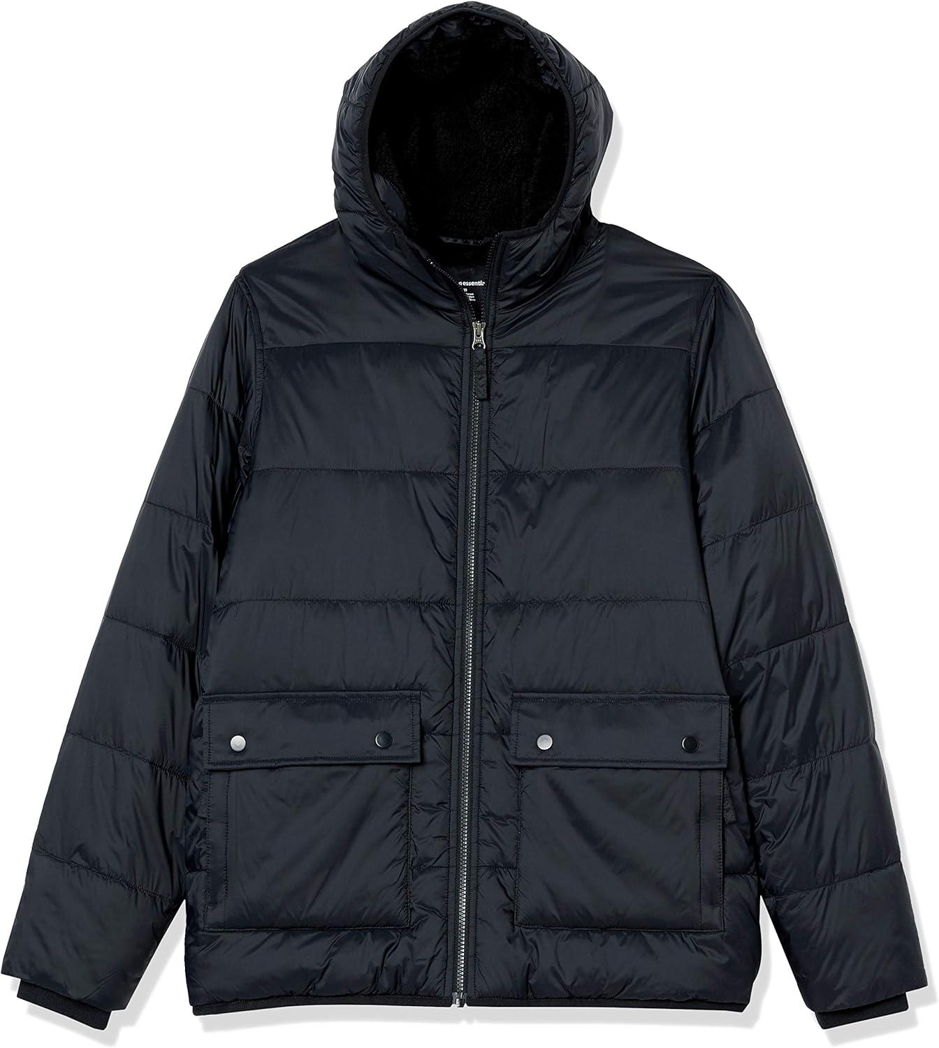 Amazon Essentials Men's Long-Sleeve Water-Resistant Sherpa-Lined Puffer Jacket(Black)