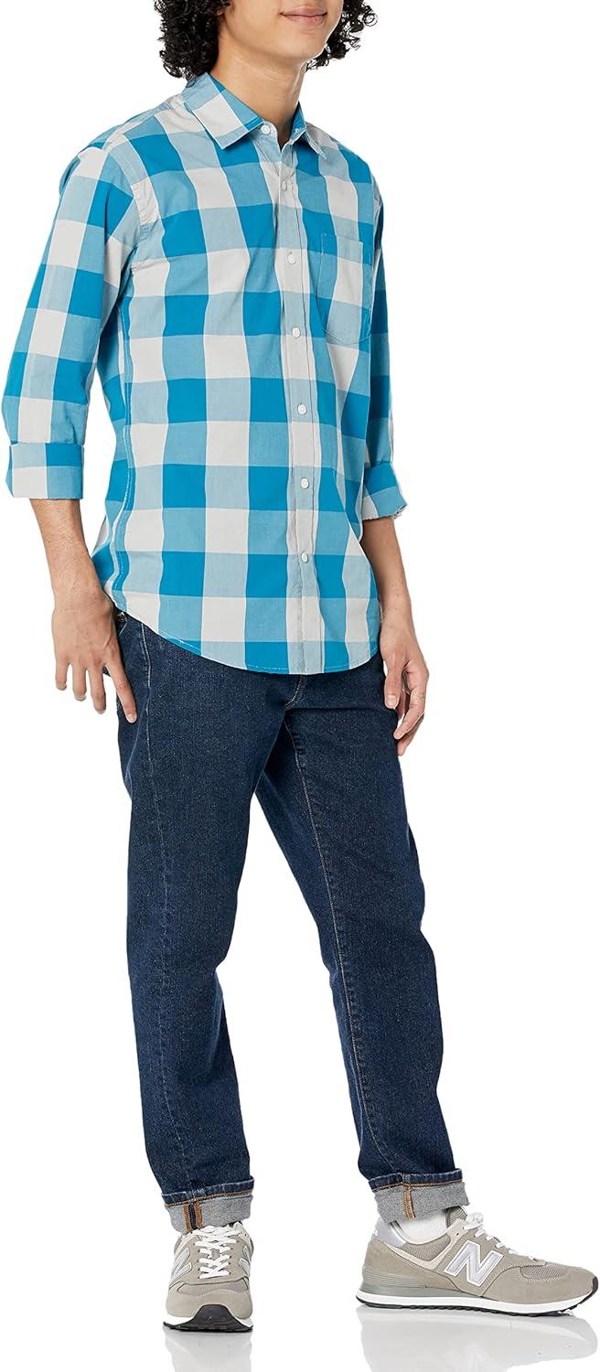 Amazon Essentials Men’s Regular-Fit Long-Sleeve Casual Poplin Shirt(Blue White Buffalo Plaid)
