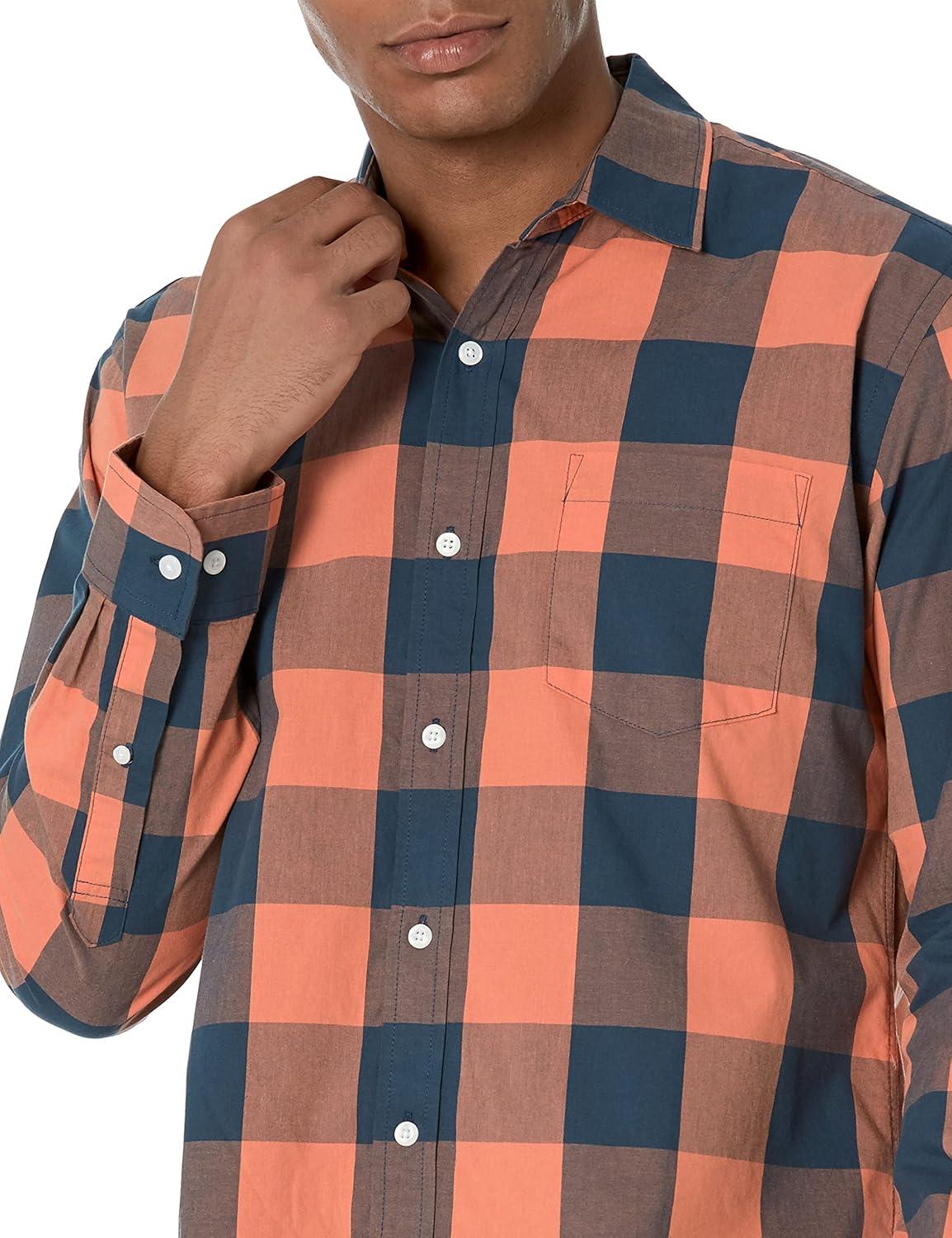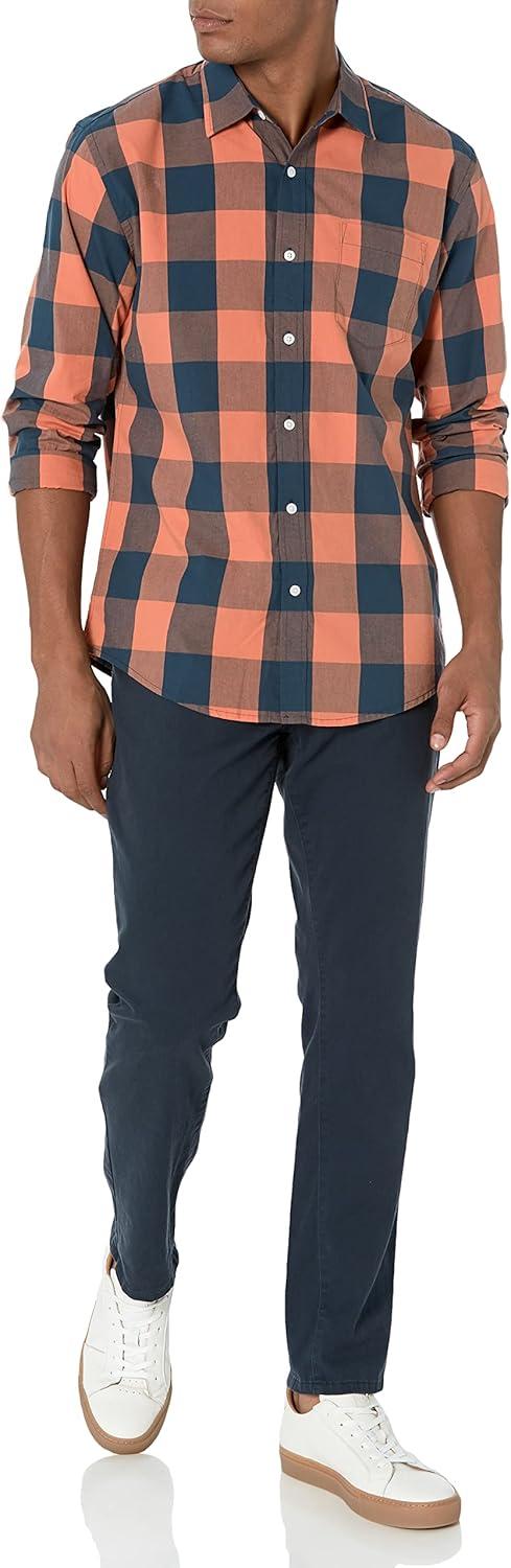 Amazon Essentials Men’s Regular-Fit Long-Sleeve Casual Poplin Shirt(Navy Orange Buffalo)