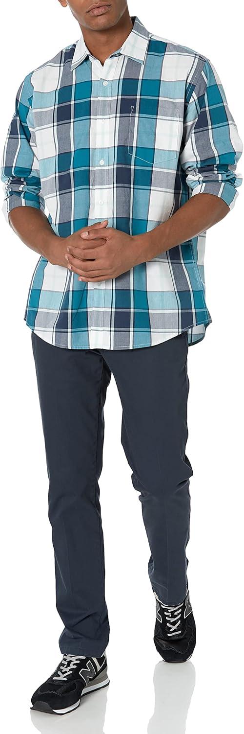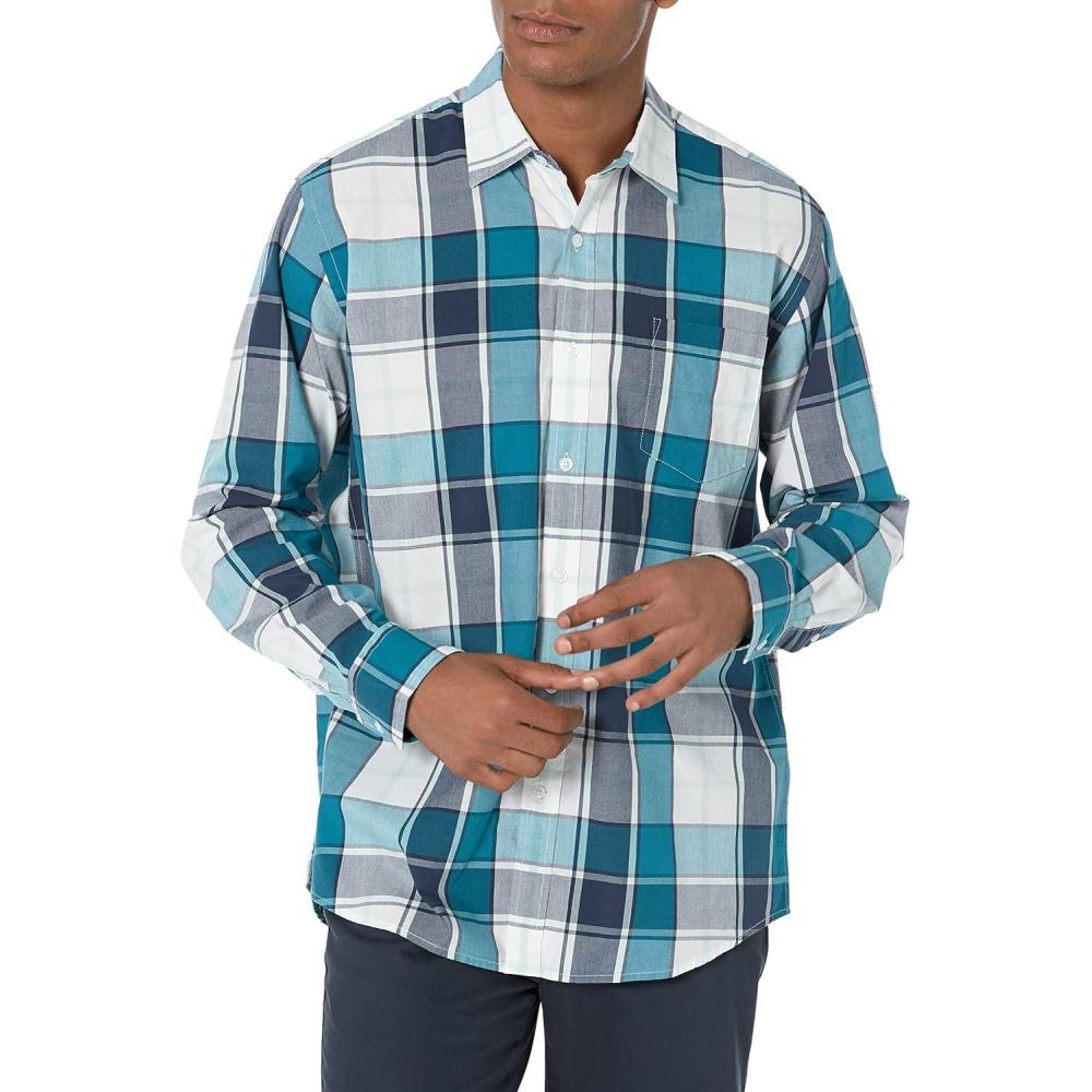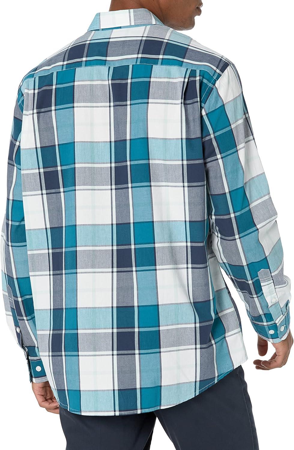 Amazon Essentials Men’s Regular-Fit Long-Sleeve Casual Poplin Shirt(Teal Blue Navy Large Plaid)