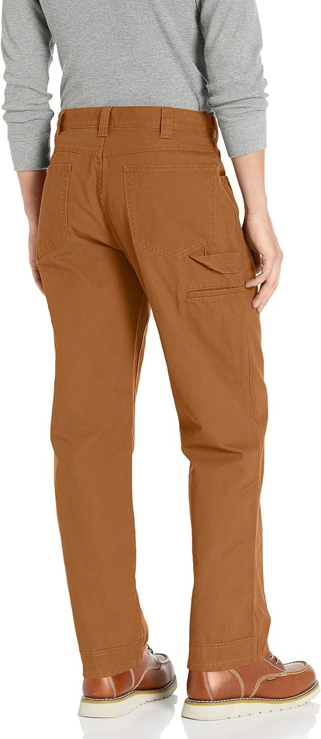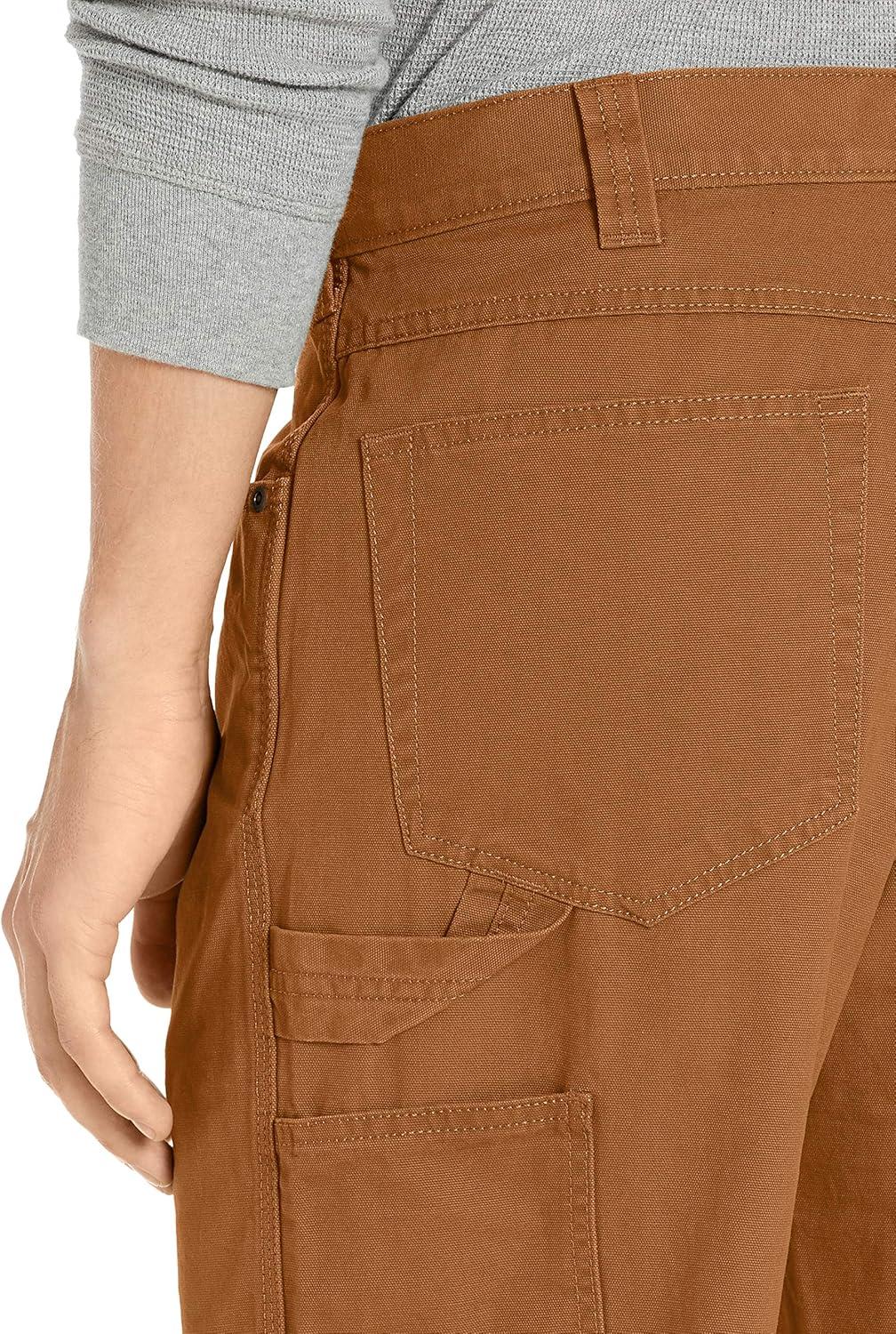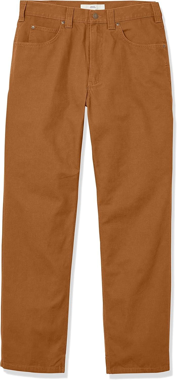 Amazon Essentials Men's Carpenter Utility Pant are made from a midweight cotton canvas. These utility pants have a relaxed fit through the hip, thigh, and leg, and sit at the waist. The classic carpenter design of these men's pants features denim-style pockets and tool loops. Our men's carpenter pants have a zip fly, metal button waistband closure, and rivet reinforcements.
