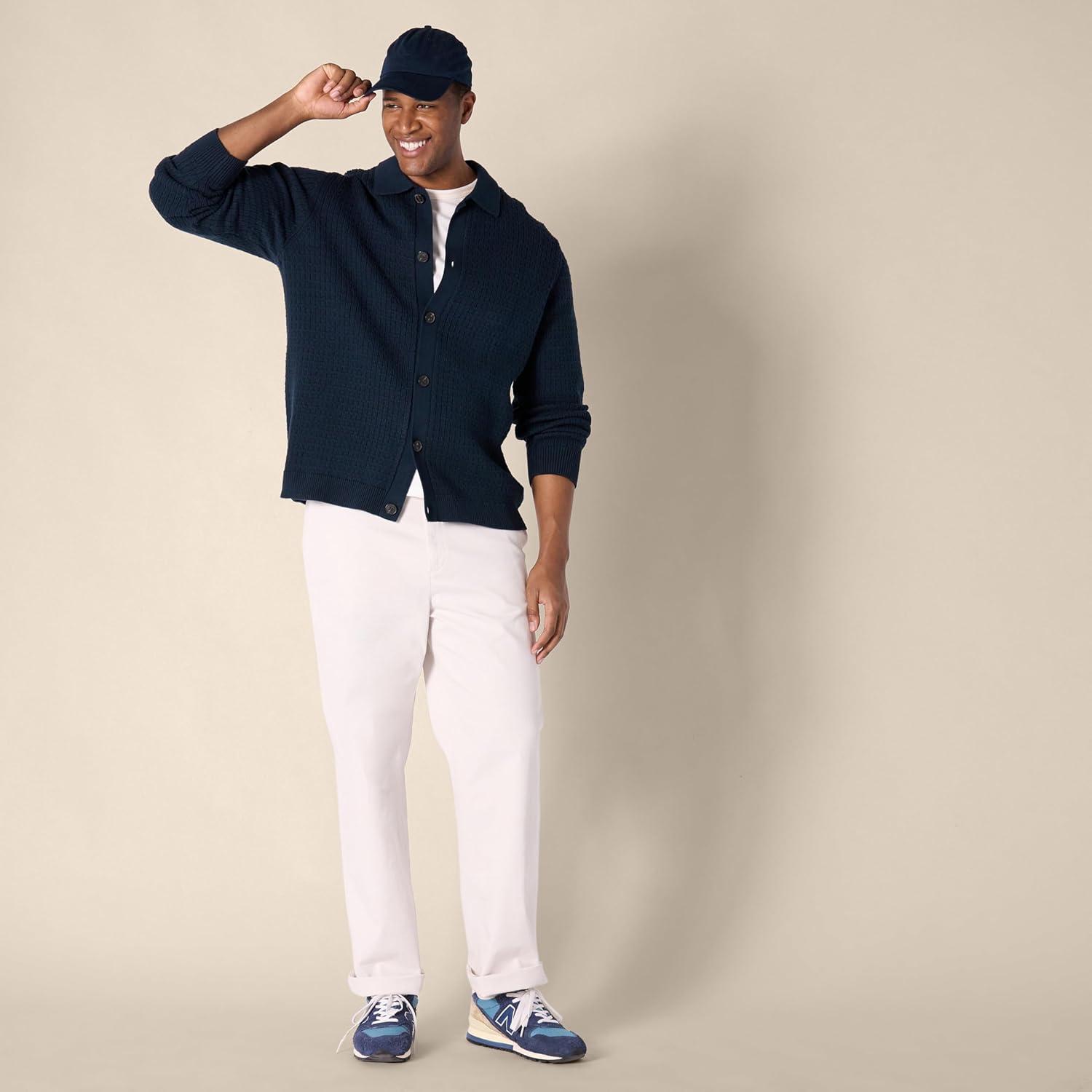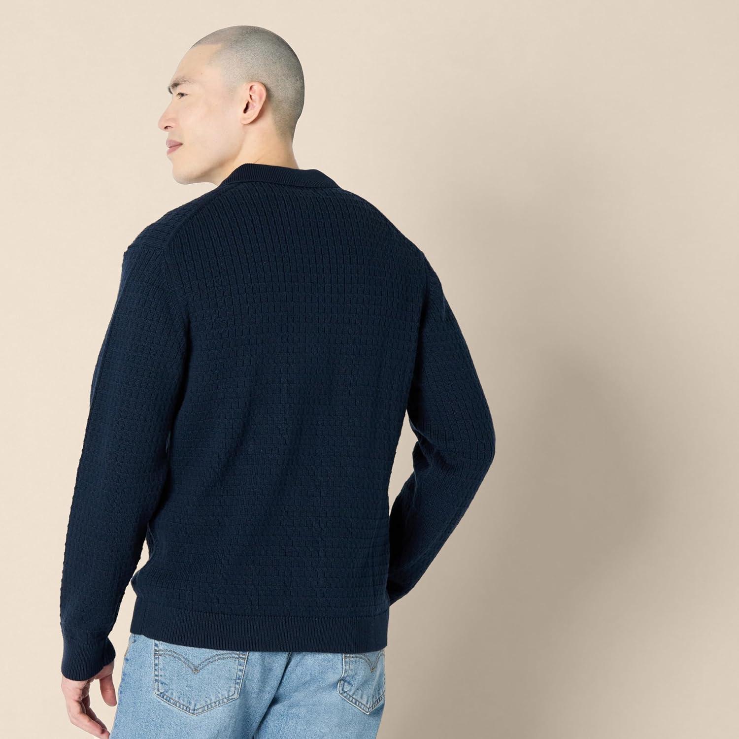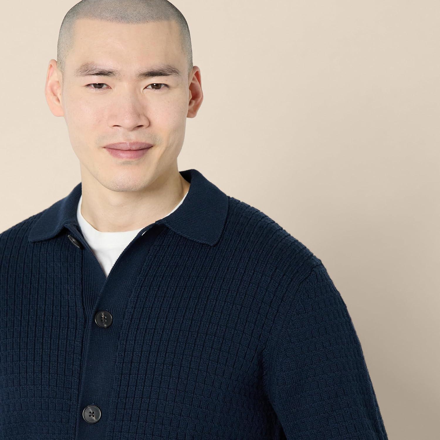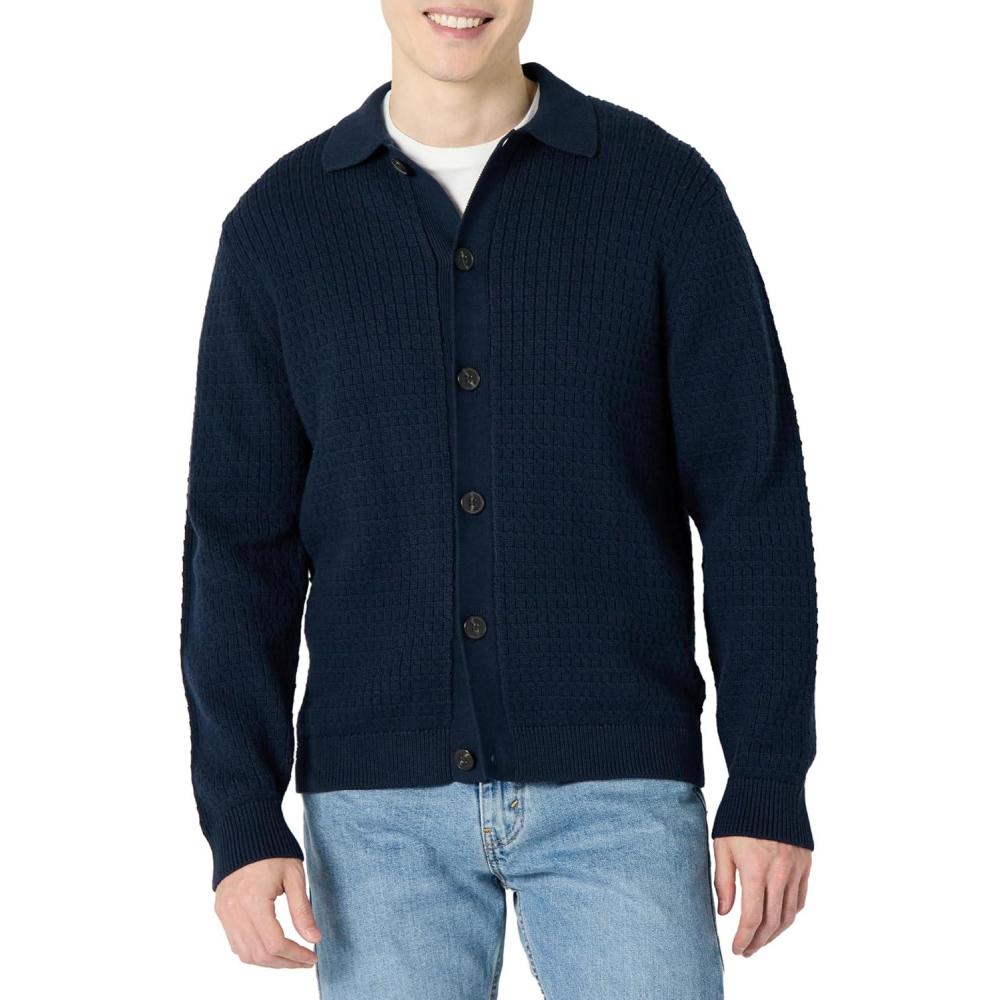 Amazon Essentials Men’s Relaxed-Fit Collared Cardigan Sweater(Navy)