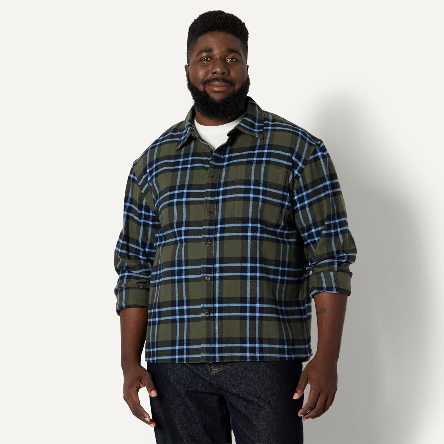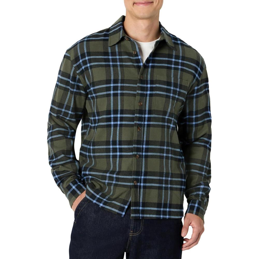 Amazon Essentials Men’s Relaxed-Fit Long-Sleeve Flannel Shirt(Dark Olive Blue Simple Plaid)