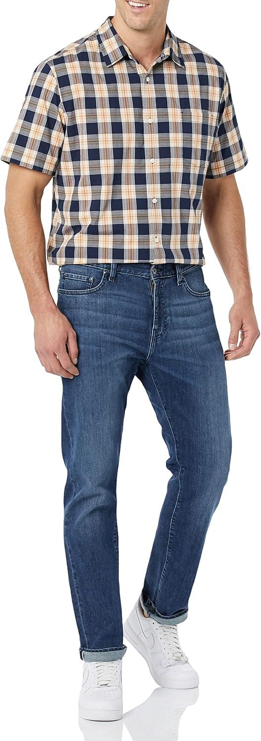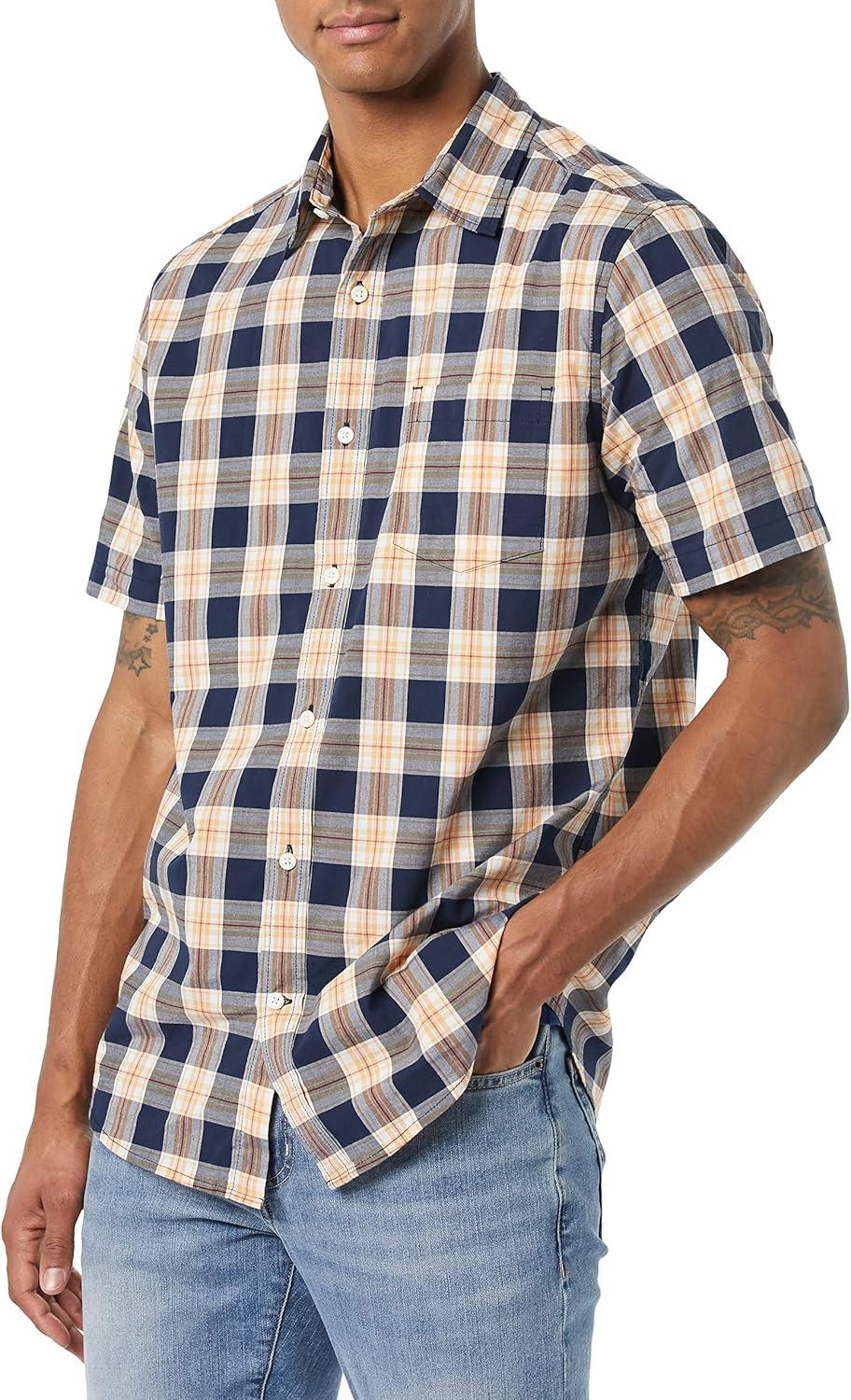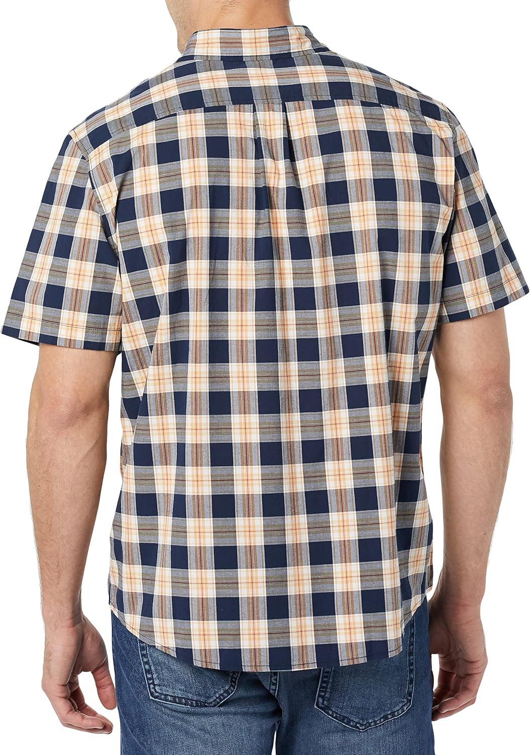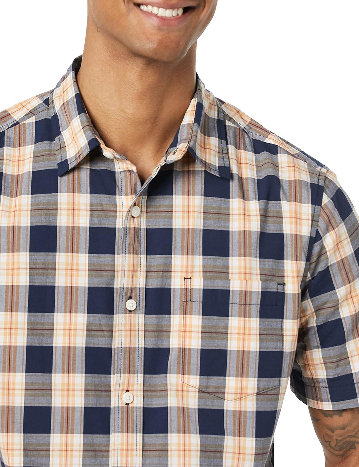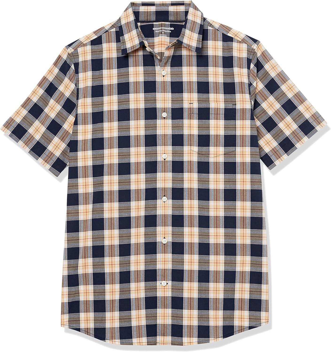 Amazon Essentials mens Short-sleeve Regular-fit Stretch Poplin Shirt(Navy Peach Plaid)