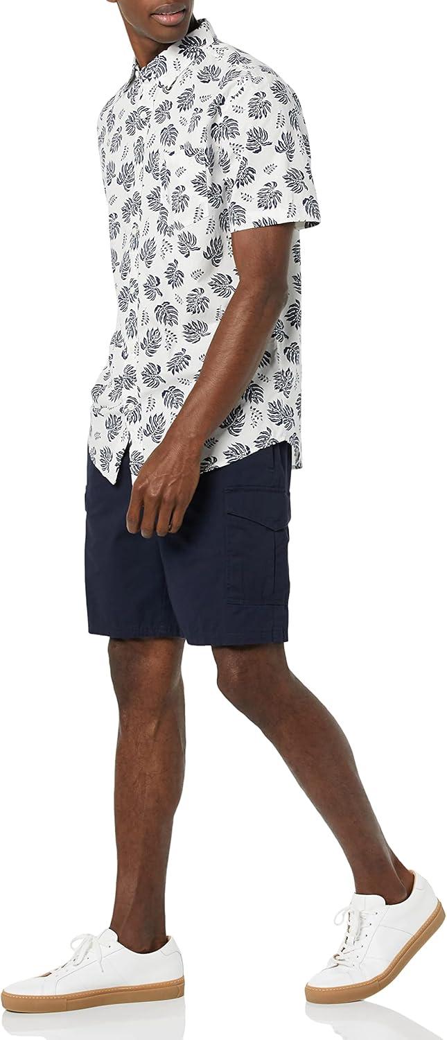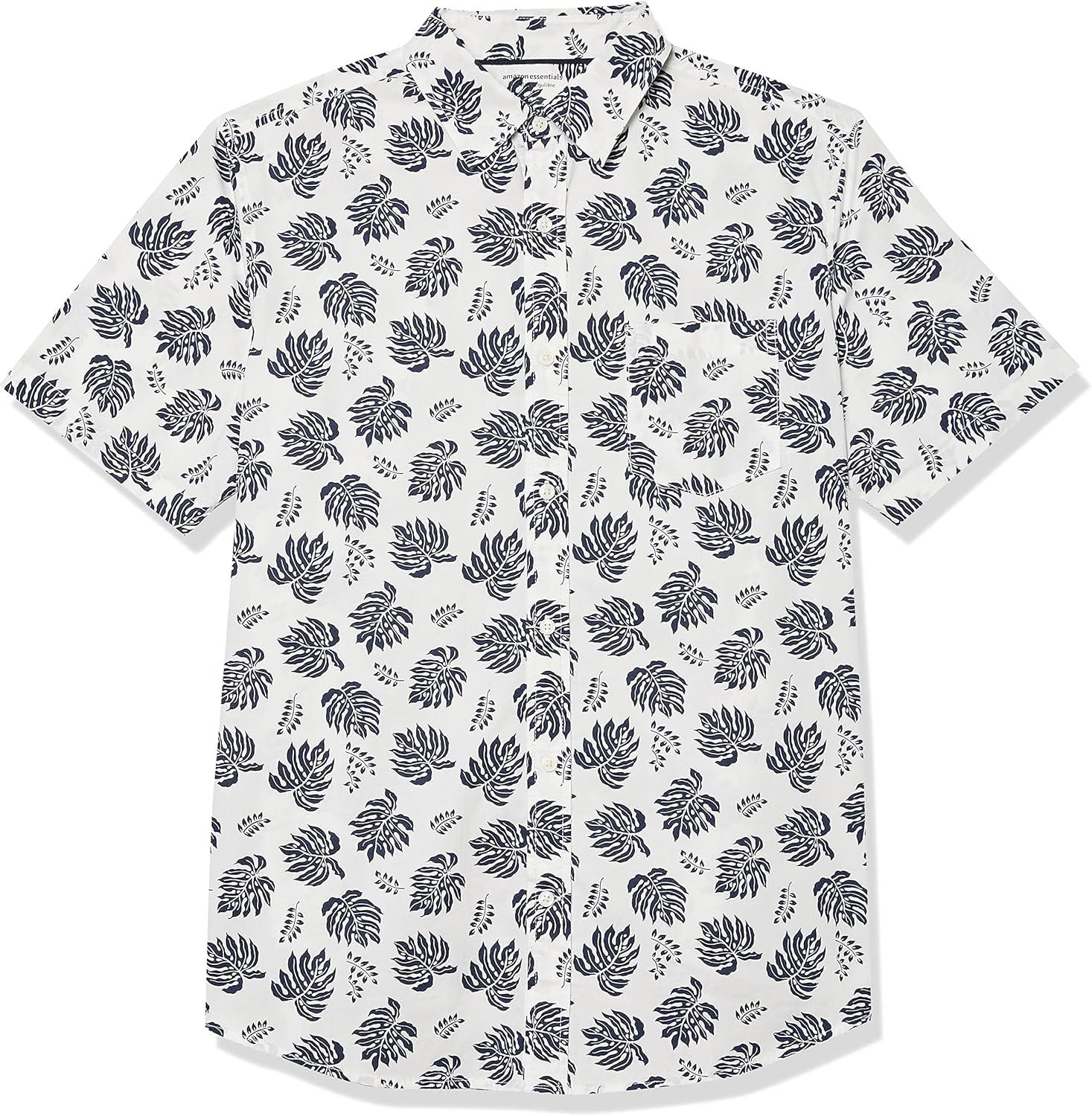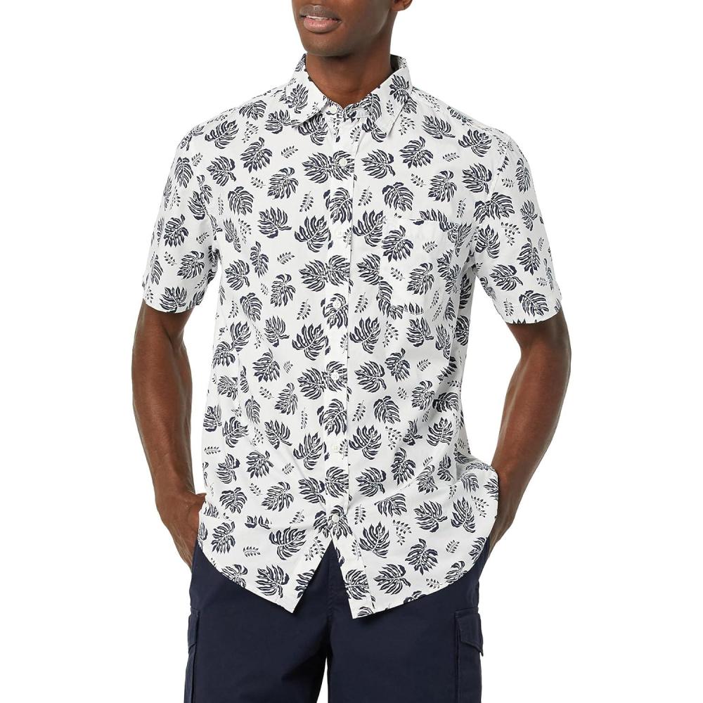 Amazon Essentials mens Short-sleeve Regular-fit Stretch Poplin Shirt(Navy White Palm Leaf)