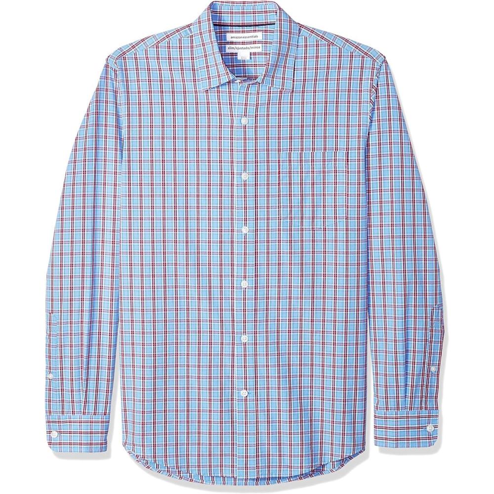 Amazon Essentials Men’s Slim-Fit Long-Sleeve Poplin Shirt(Blue Plaid/Red)