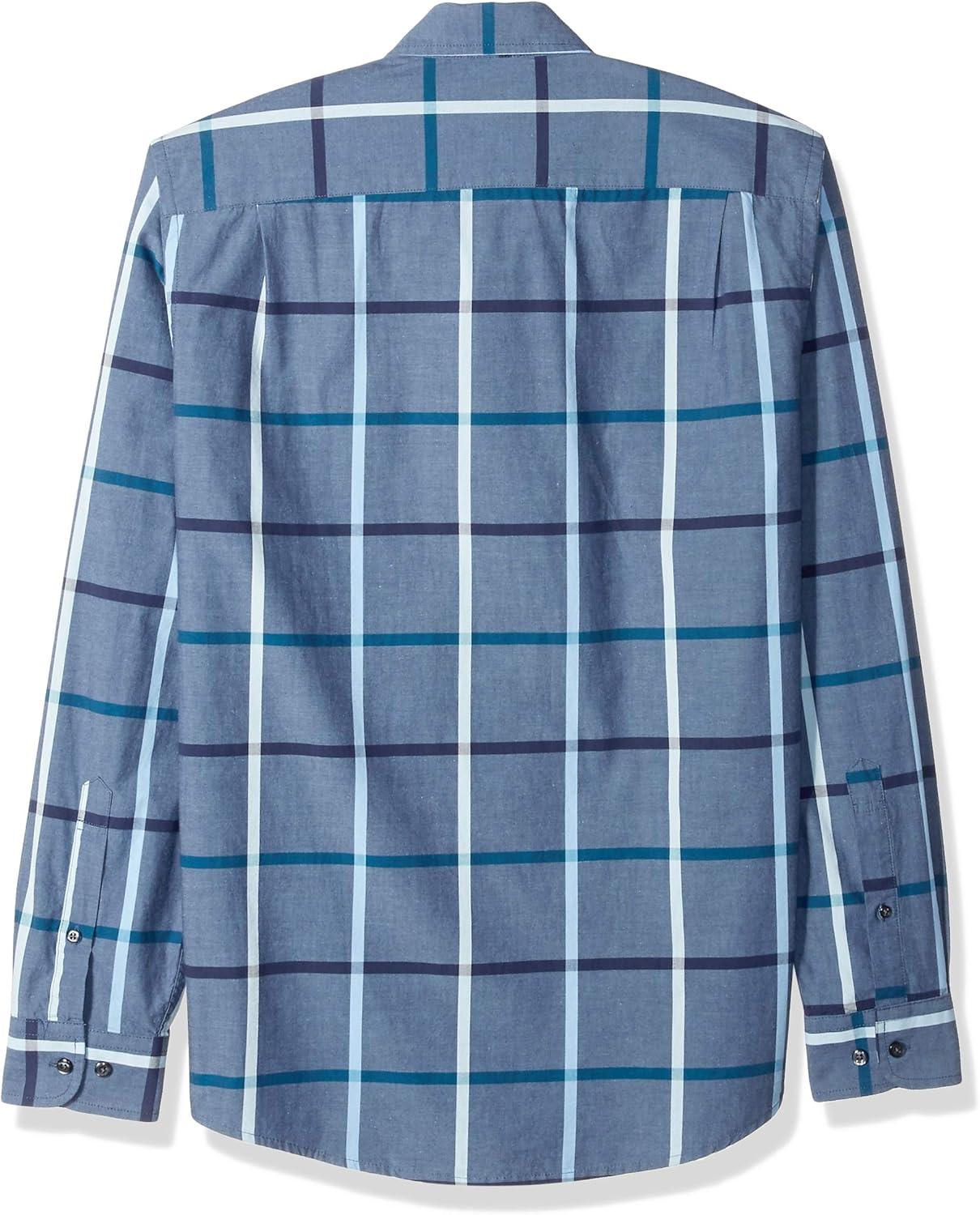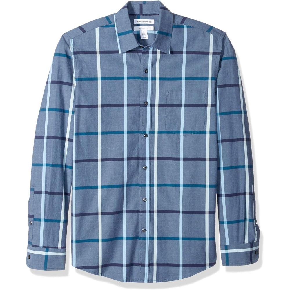 Amazon Essentials Men’s Slim-Fit Long-Sleeve Poplin Shirt(Denim Large Plaid)