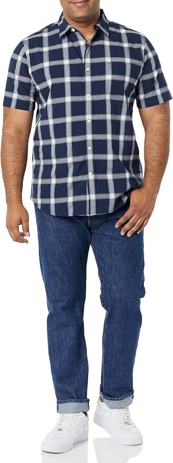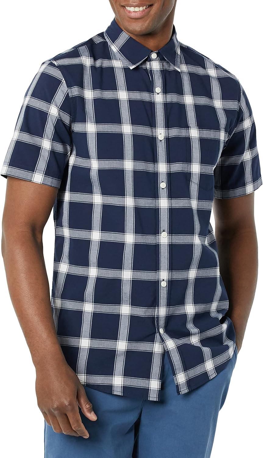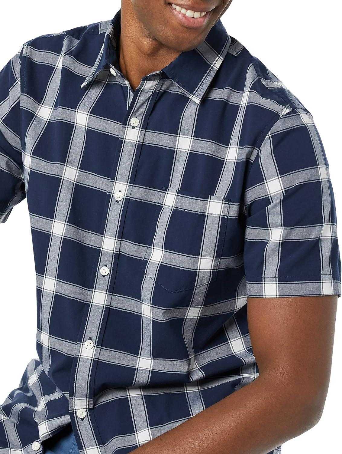 Amazon Essentials Men’s Slim-Fit Short-Sleeve Poplin Shirt(Navy White Buffalo Plaid)
