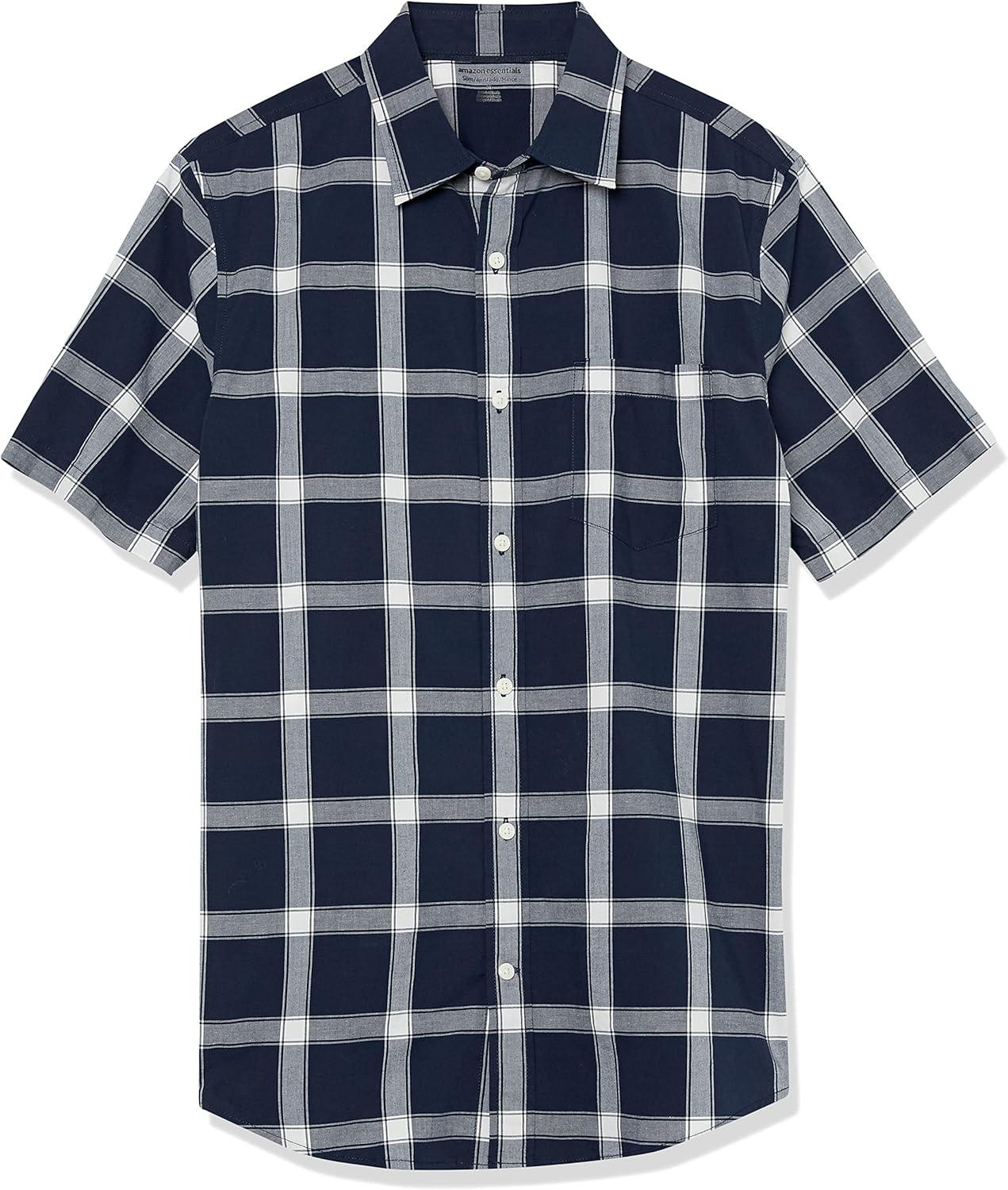 Amazon Essentials Men's Slim-Fit Short-Sleeve Poplin Shirt(Navy White Buffalo Plaid)