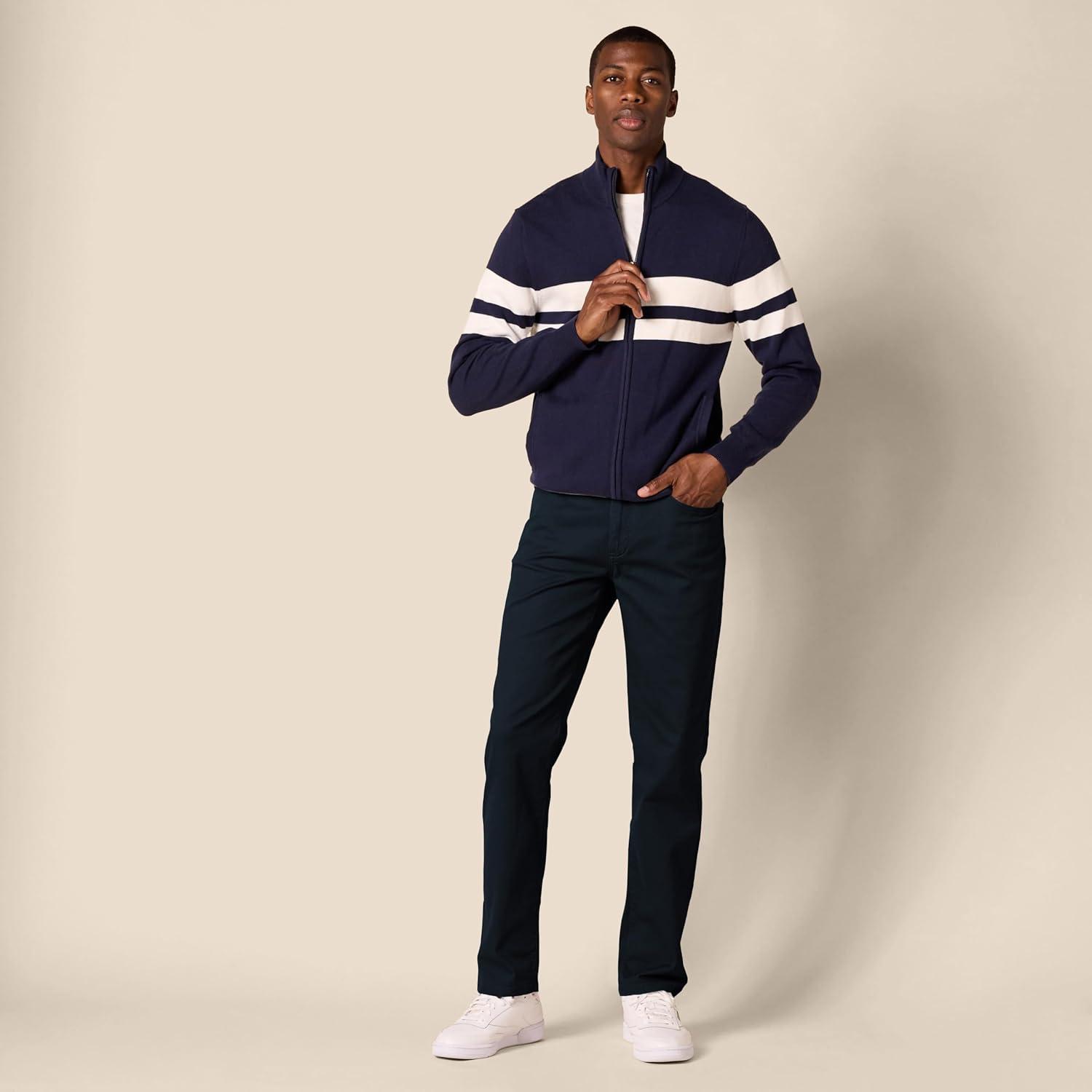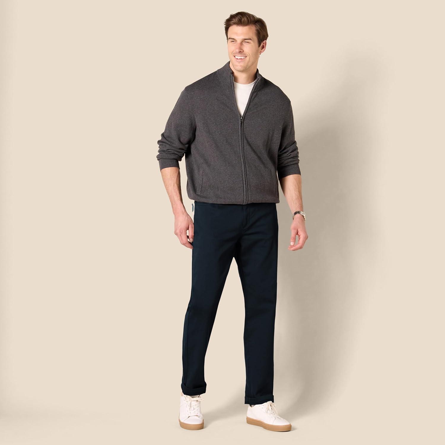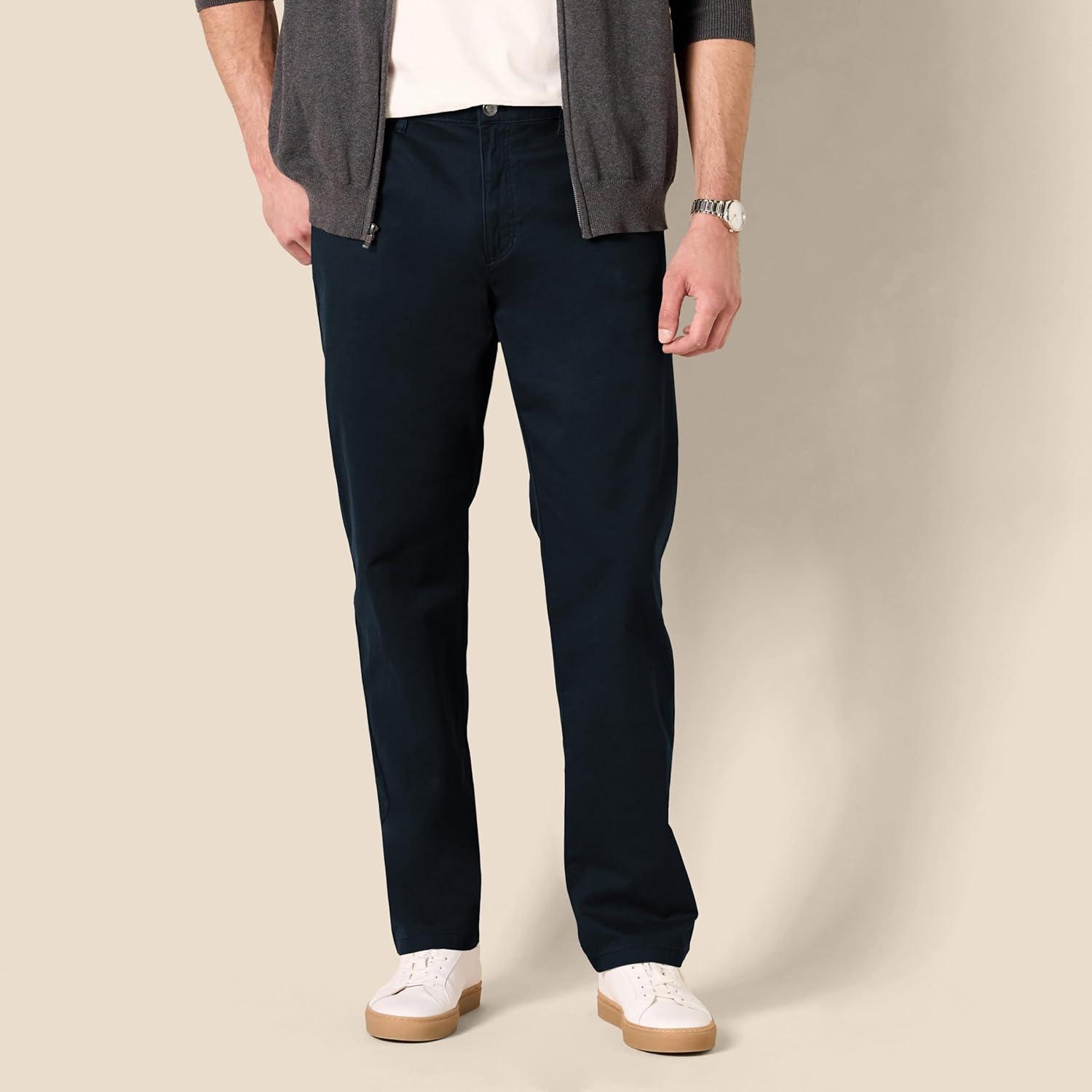 Amazon Essentials Men's Straight-Fit 5-Pocket Stretch Twill Pant offer a straight fit with slight ease through the hip and thigh. These pants sit at the waist, for a classic look. Designed with everyday wear in mind, these men's stretch twill pants feature 5-pocket styling that is inspired by jeans. Our men's stretch twill pants have a shank button closure, rivets, and zipper fly.