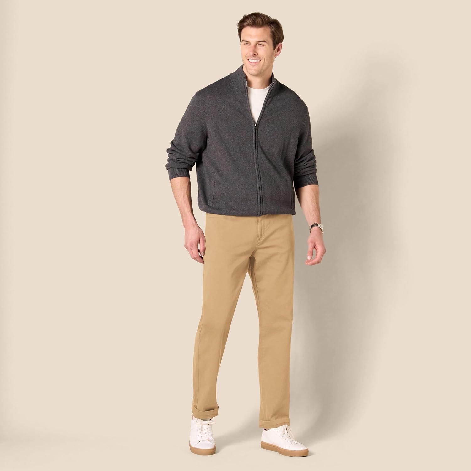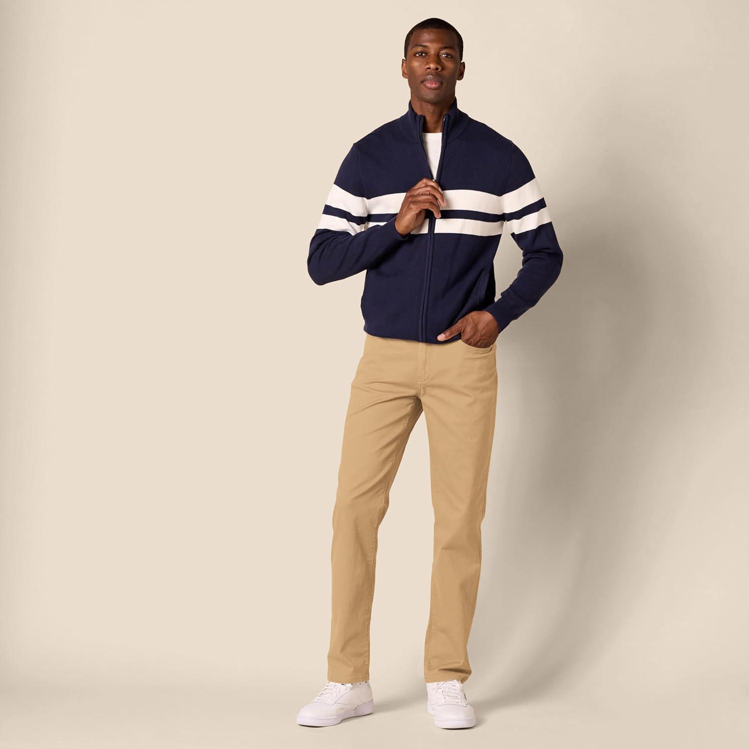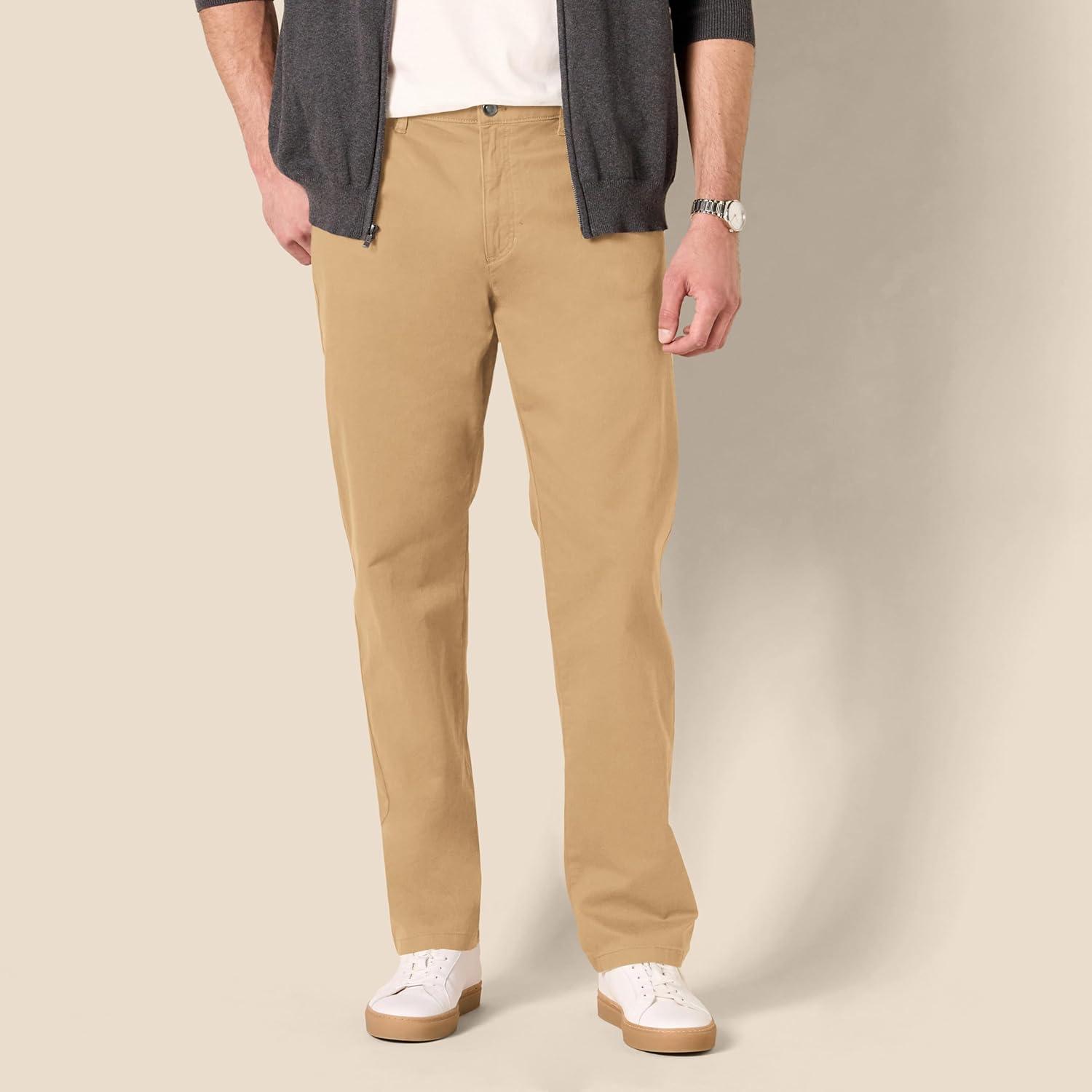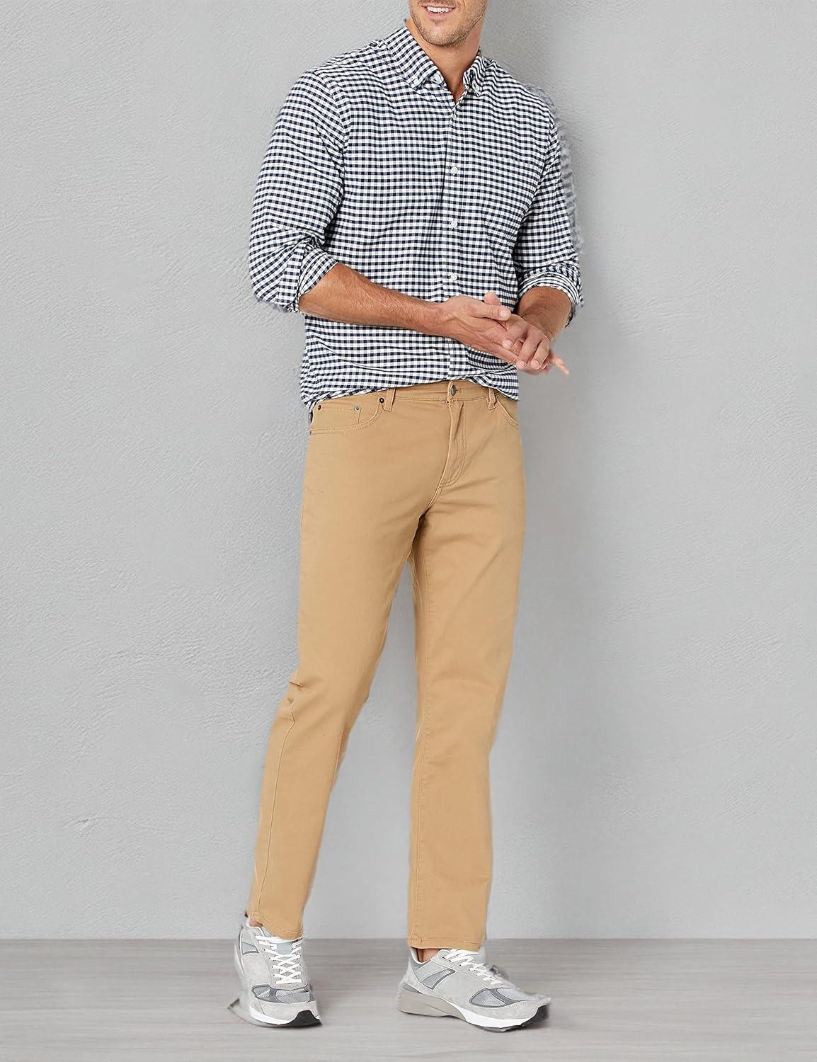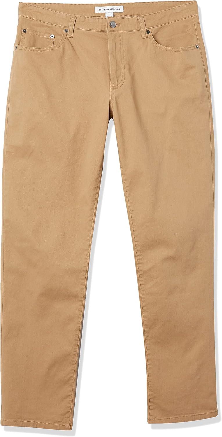 Amazon Essentials Men's Straight-Fit 5-Pocket Stretch Twill Pant offer a straight fit with slight ease through the hip and thigh. These pants sit at the waist, for a classic look. Designed with everyday wear in mind, these men's stretch twill pants feature 5-pocket styling that is inspired by jeans. Our men's stretch twill pants have a shank button closure, rivets, and zipper fly.